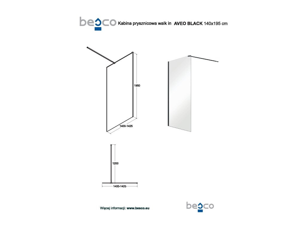BESCO Walk-in sprchový kout AVEO BLACK Barva rámu - Černá, Pevná stěna - Bez pevné stěny, Rozměr A - 140, Rozměr C - 195, Výplň - Čiré bezpečnostní sklo - 8 mm BCAVEO140BL
