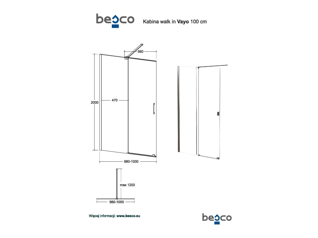 BESCO Walk-in sprchový kout VAYO CHROM Barva rámu - Chrom/Leštěný hliník (ALU), Rozměr A - 100, Rozměr C - 200, Směr zavírání - Univerzální Levé / Pravé, Výplň - Čiré bezpečnostní sklo - 8 mm BCVAYO100CC