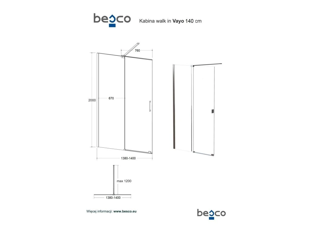 BESCO Walk-in sprchový kout VAYO CHROM Barva rámu - Chrom/Leštěný hliník (ALU), Rozměr A - 140, Rozměr C - 200, Směr zavírání - Univerzální Levé / Pravé, Výplň - Čiré bezpečnostní sklo - 8 mm BCVAYO140CC