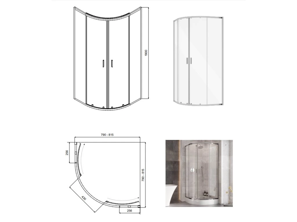 - designový čtvrtkruhový sprchový kout s černými profily včetně sprchové vaničky a sprchového sifonu