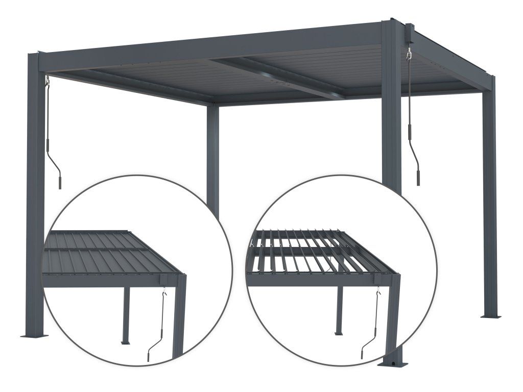 Díky manuálně ovládaným pozinkovaným lamelám si snadno nastavíte ideální podmínky – od stínu během horkých dní až po plnou ochranu před deštěm. Lamely lze naklopit tak, aby zajistily správnou ventilaci nebo zamezily přehřívání prostoru. Velký rozsah od úhlu 110 ° až do úplného uzavření umožňuje jak cirkulaci vzduchu podle potřeby, tak spolehlivou ochranu před deštěm nebo slunečním žárem.