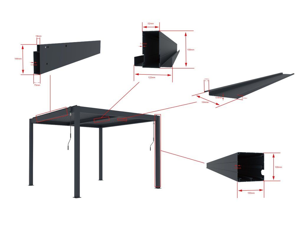 - Široká škála dokoupitelného příslušenství pro dokonalé přizpůsobení pergoly vašim potřebám