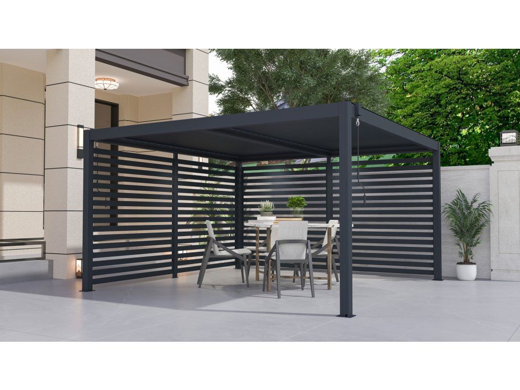 Bioklimatická pergola je inovativní venkovní konstrukce s rotačními střešními lamelami, které vám umožní regulovat teplotu, ventilaci i ochranu proti dešti. Lamely mají velký rozsah, otevírají se až do úhlu 110° a v uzavřené pozici jsou vodotěsné. Tento systém kombinuje pohodlí, styl a funkčnost v jednom. Díky široké škále dalších doplňků si můžete dokonale přizpůsobit svým potřebám a představám.