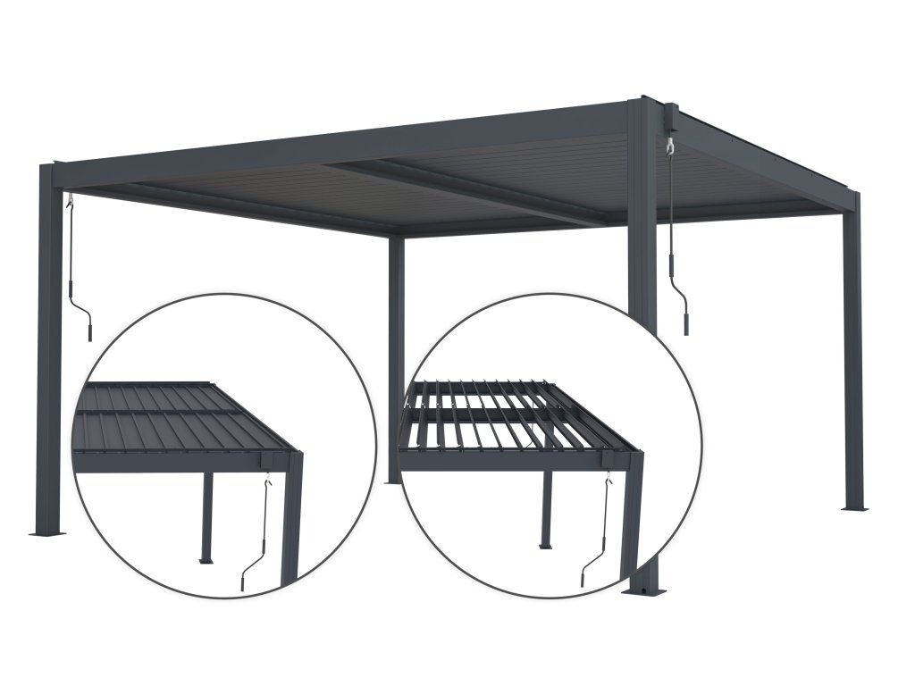 Díky manuálně ovládaným pozinkovaným lamelám si snadno nastavíte ideální podmínky – od stínu během horkých dní až po plnou ochranu před deštěm. Lamely lze naklopit tak, aby zajistily správnou ventilaci nebo zamezily přehřívání prostoru. Velký rozsah od úhlu 110 ° až do úplného uzavření umožňuje jak cirkulaci vzduchu podle potřeby, tak spolehlivou ochranu před deštěm nebo slunečním žárem.