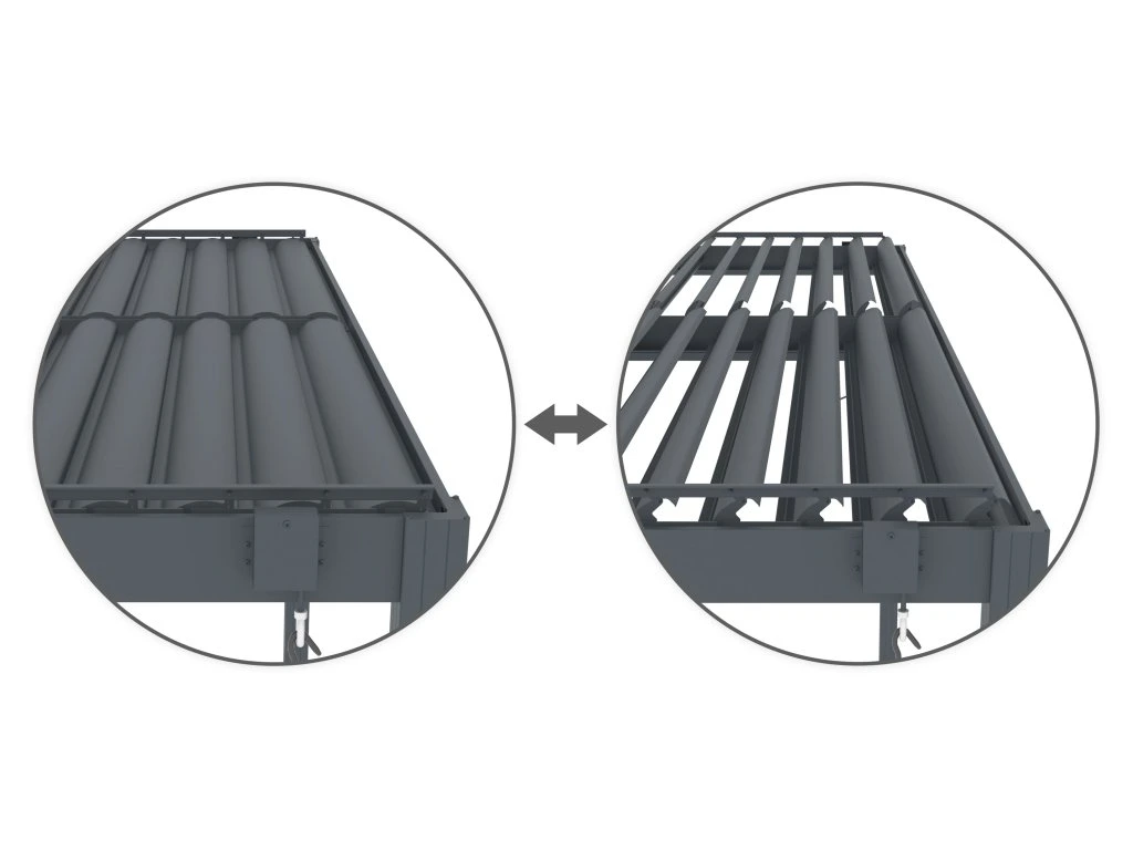 • Rotační střešní lamely pro regulaci stínu, ventilace i ochrany před deštěm