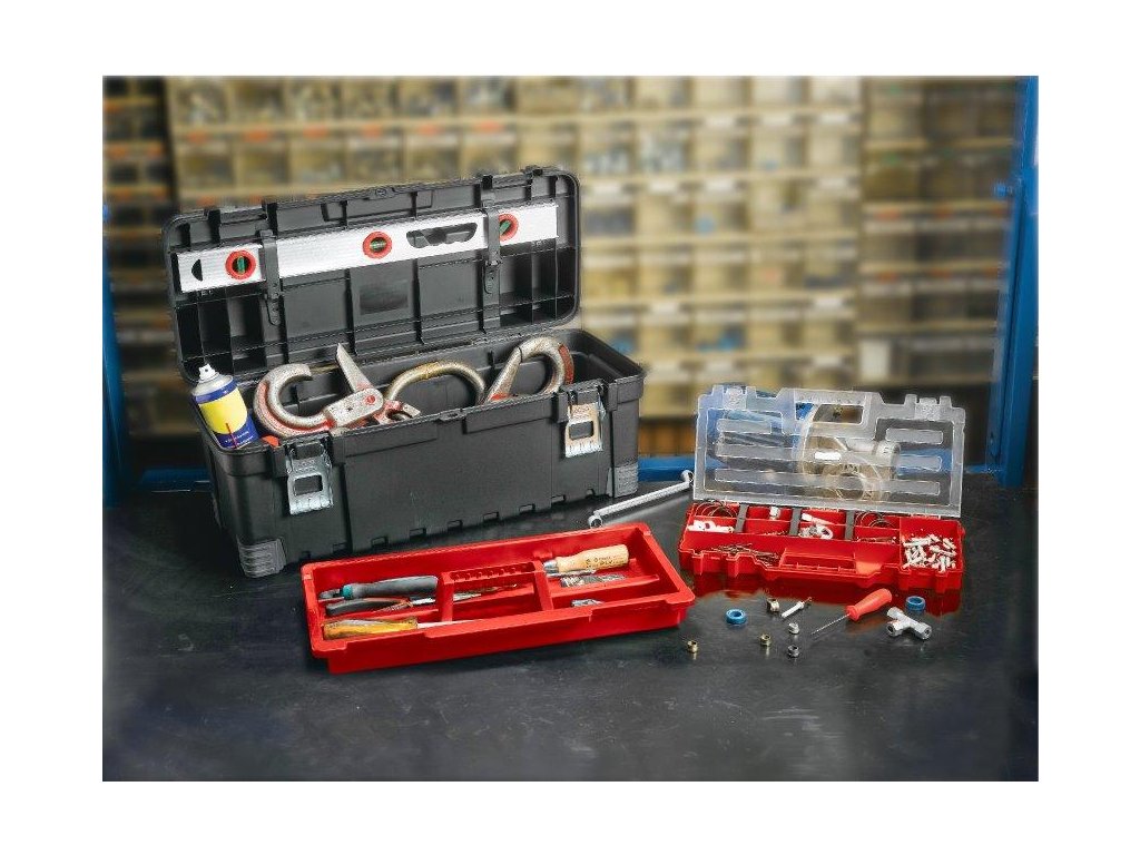 Gumové přepážky vám umožní přizpůsobit si vnitřní prostor boxu podle typu nářadí. Kovové západky a zajišťovací popruhy zajistí pevné uzavření kufru. V případě, že chcete mít přístup k nářadí jen vy, uzamkněte box klasickým visacím zámkem. Ten si ovšem musíte dokoupit zvlášť. Praktické madlo vám navíc zjednoduší jeho přenášení a manipulaci.