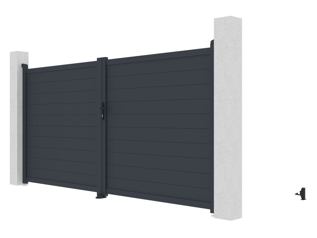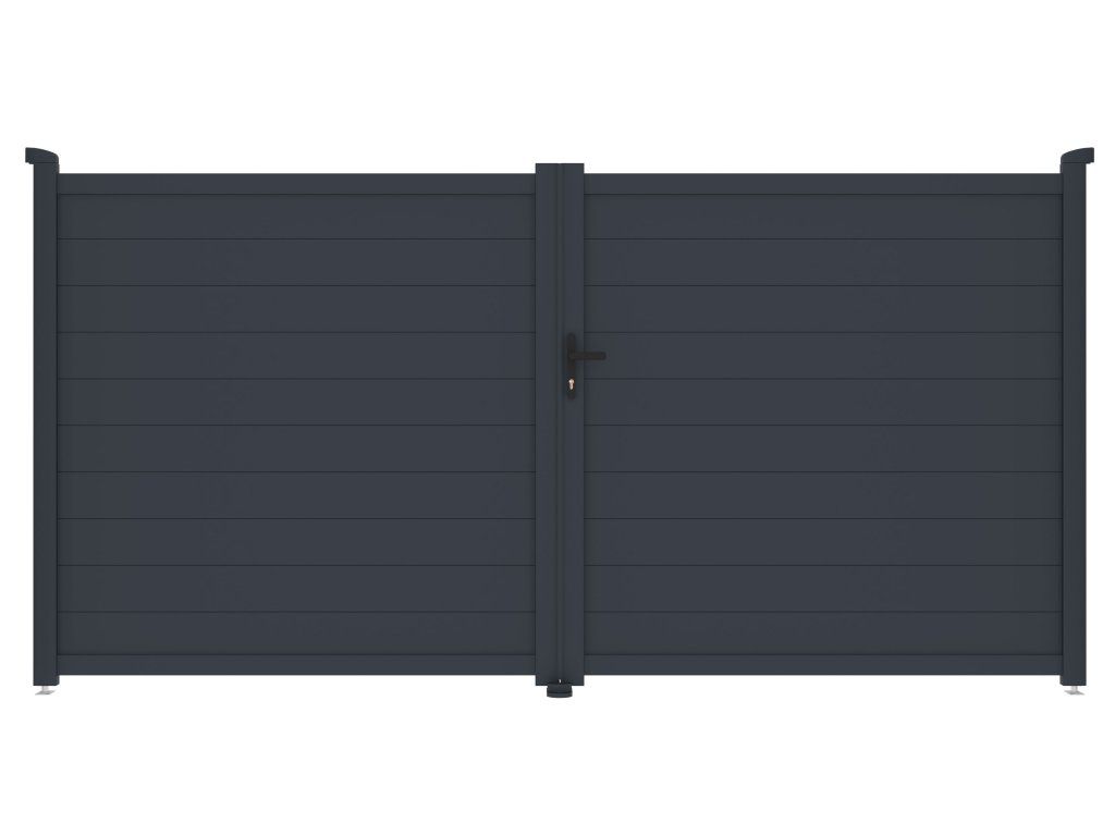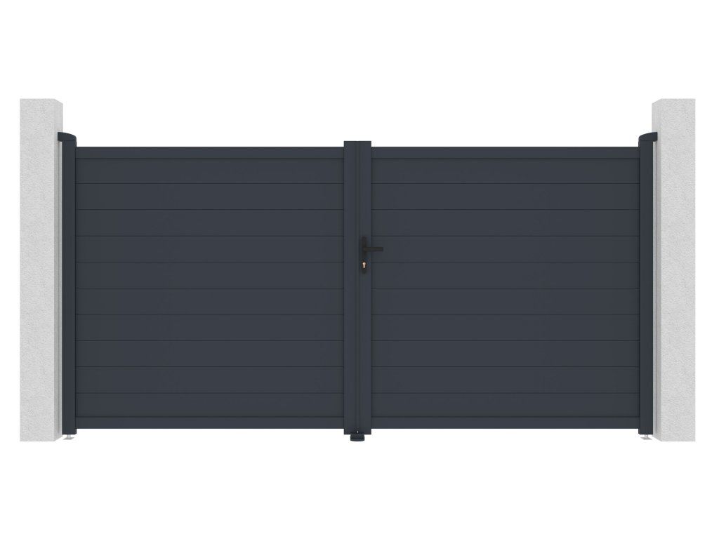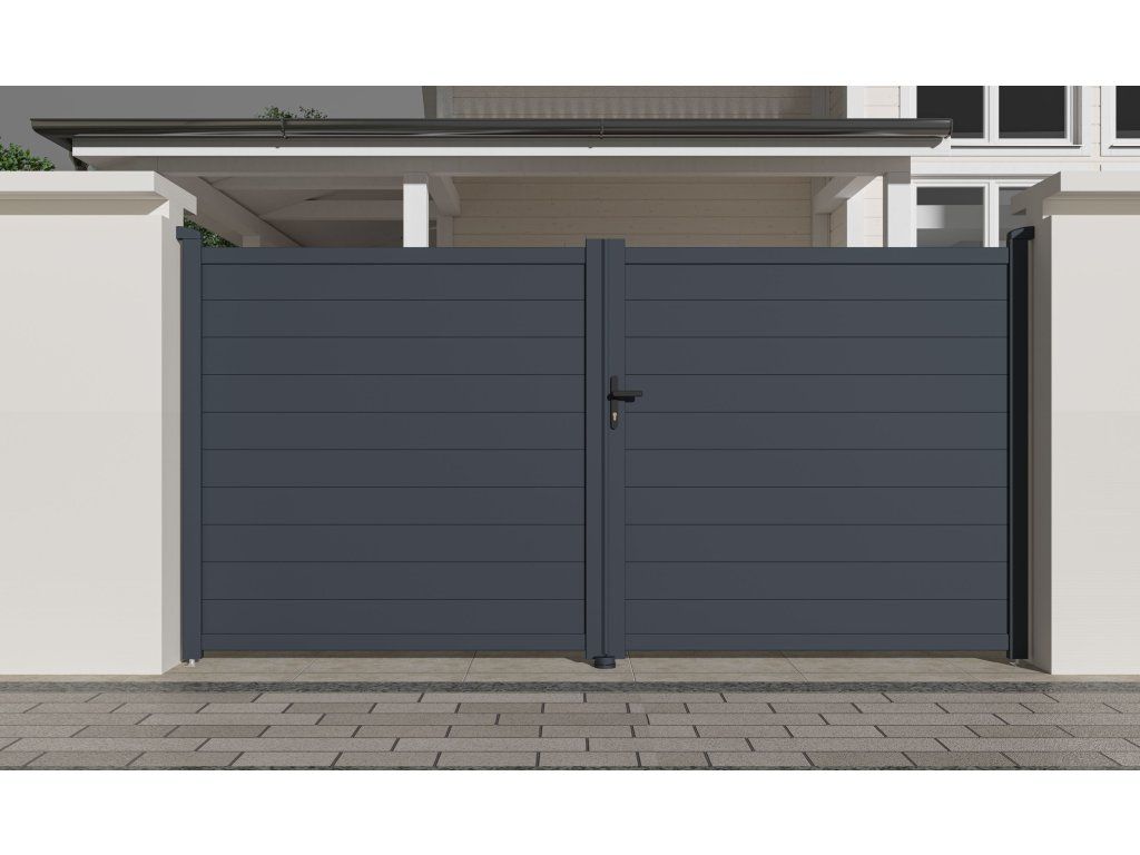 Výplň s horizontálně uloženými lamelami v atraktivním grafitovém provedení kombinuje dostatek soukromí s moderním designem, takže brána s otevíráním dovnitř bude slušet každému typu oplocené stavby.