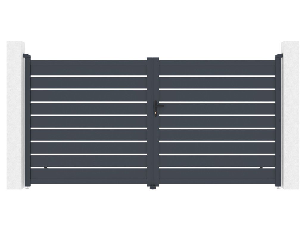 Výplň s horizontálně uloženými lamelami v atraktivním grafitovém provedení kombinuje dostatek soukromí s moderním designem, takže brána s otevíráním dovnitř bude slušet každému typu oplocené stavby.