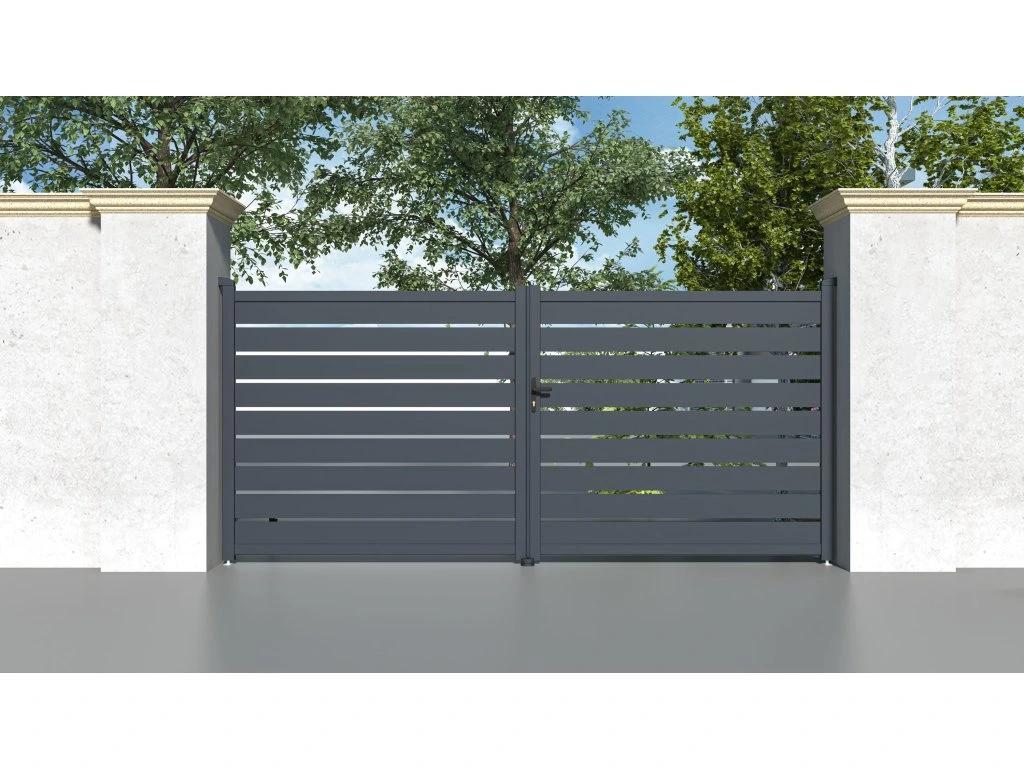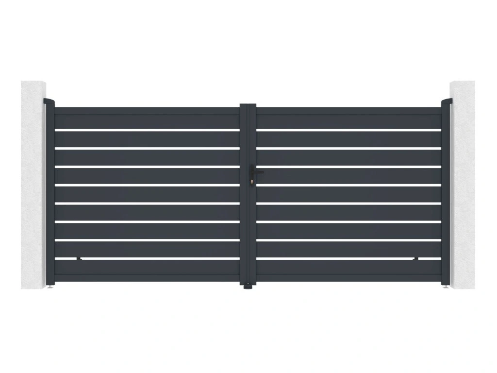Výplň s horizontálně uloženými lamelami v atraktivním grafitovém provedení kombinuje dostatek soukromí s moderním designem, takže brána s otevíráním dovnitř bude slušet každému typu oplocené stavby.