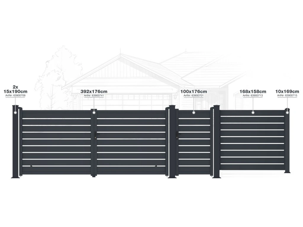 Vjezdová brána je důležitou součástí oplocení. 176 cm vysoká hliníková brána Reno má díky práškovému nástřiku ještě delší životnost, je odolná, atraktivní a její šířku můžete i přizpůsobit stávajícímu oplocení. Otevírání na kliku a zámek s FAB vložkou, šířka 392 cm umožní hladký průjezd všech vozidel.
