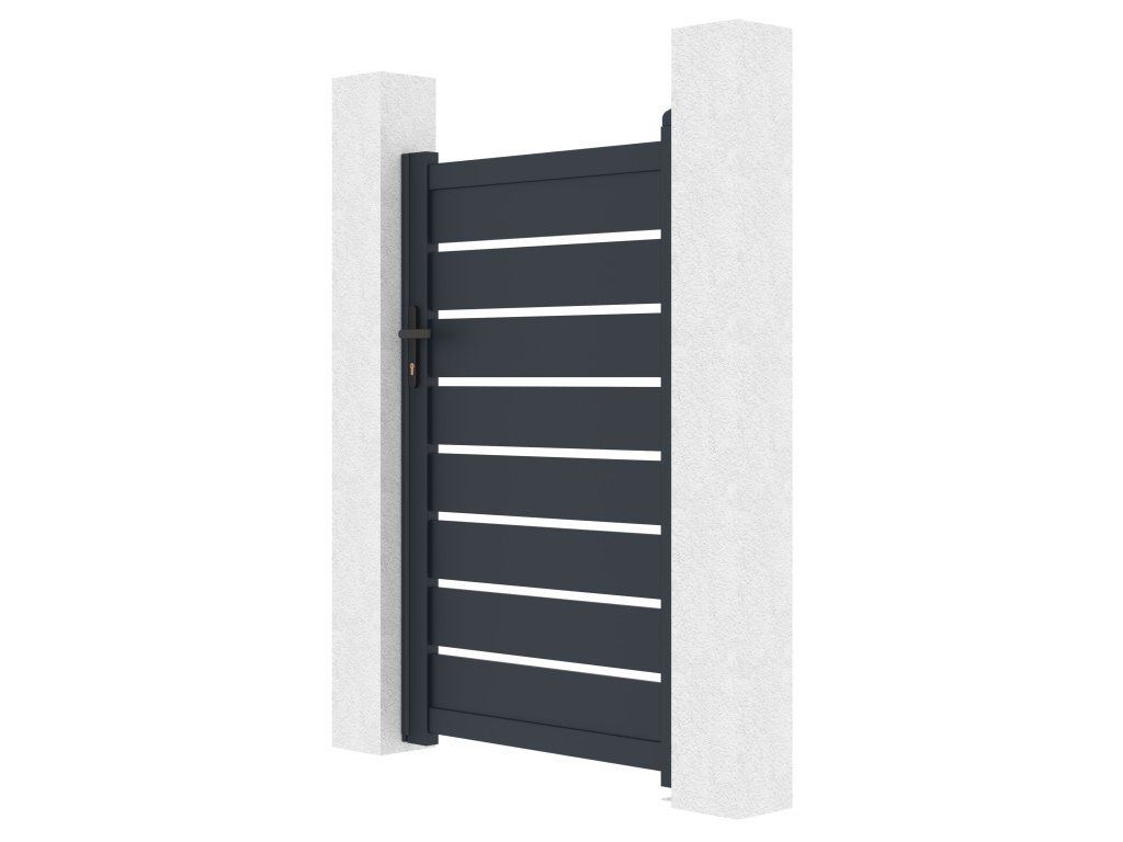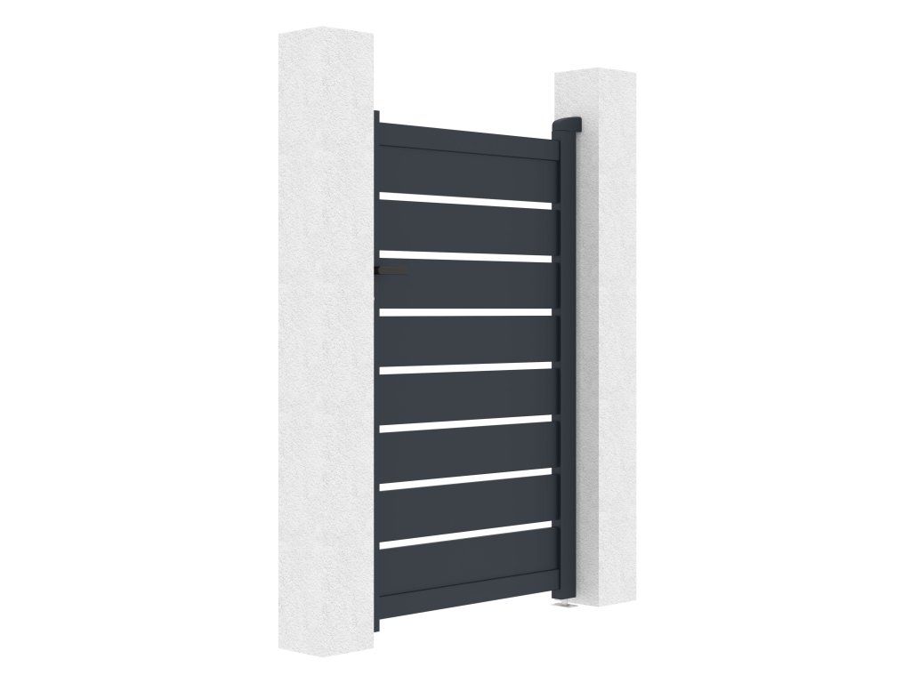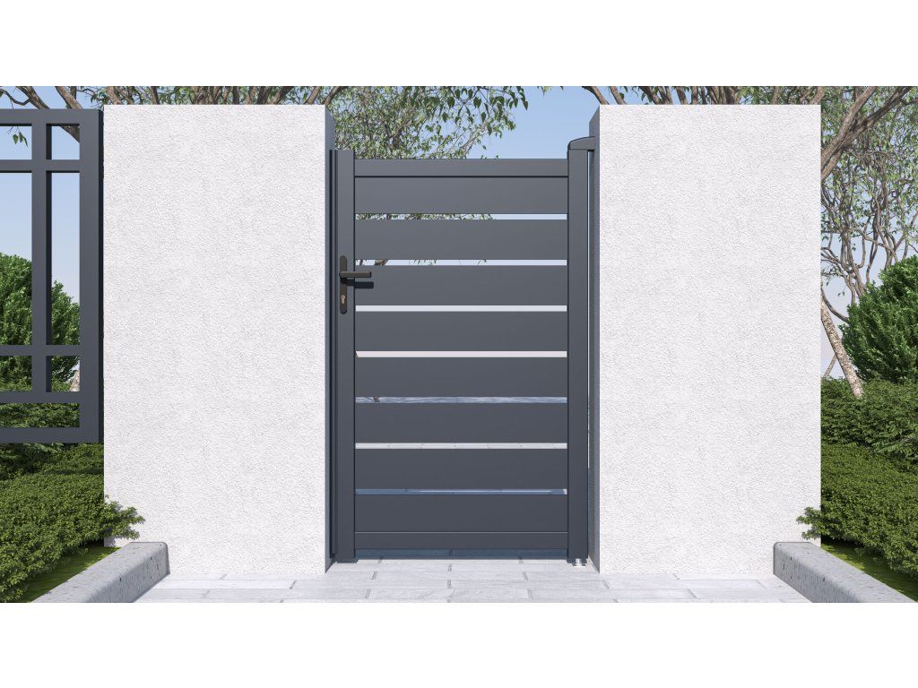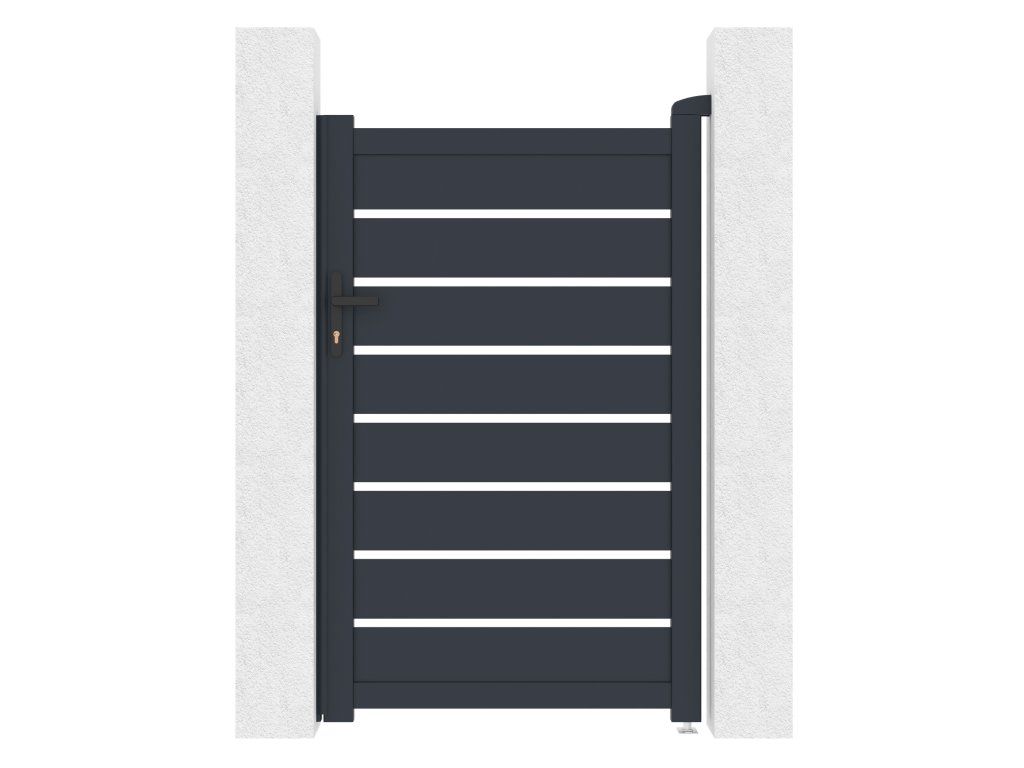 Výplň s horizontálně uloženými lamelami v atraktivním grafitovém provedení kombinuje dostatek soukromí s moderním designem, takže branka s otevíráním dovnitř bude slušet každému typu oplocené stavby.