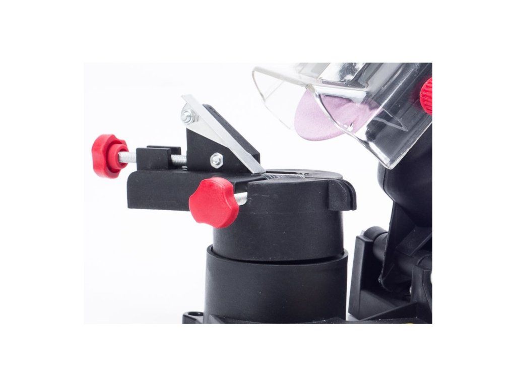 Řetěz umístíte pomocí napínáku tak, aby se vám s bruskou pohodlně pracovalo. Omezovač hloubky broušení vám zajistí přesné zpracování hrotů na řetězu. Kromě toho si přizpůsobíte jejich ostření pomocí praktické stupnice.