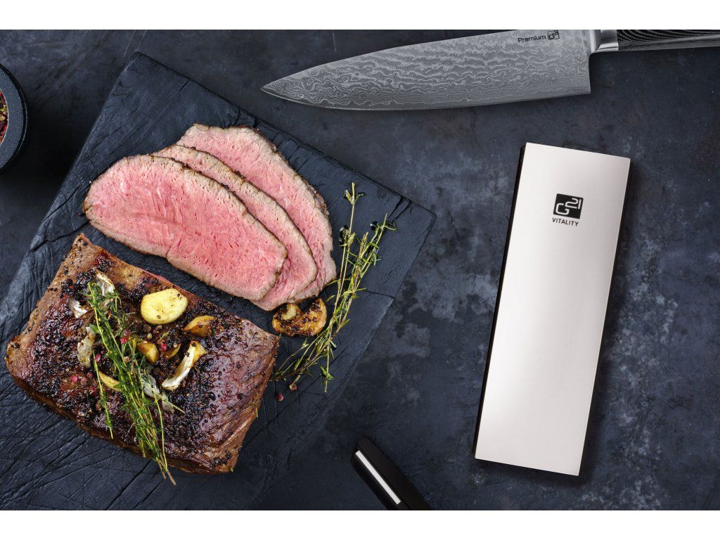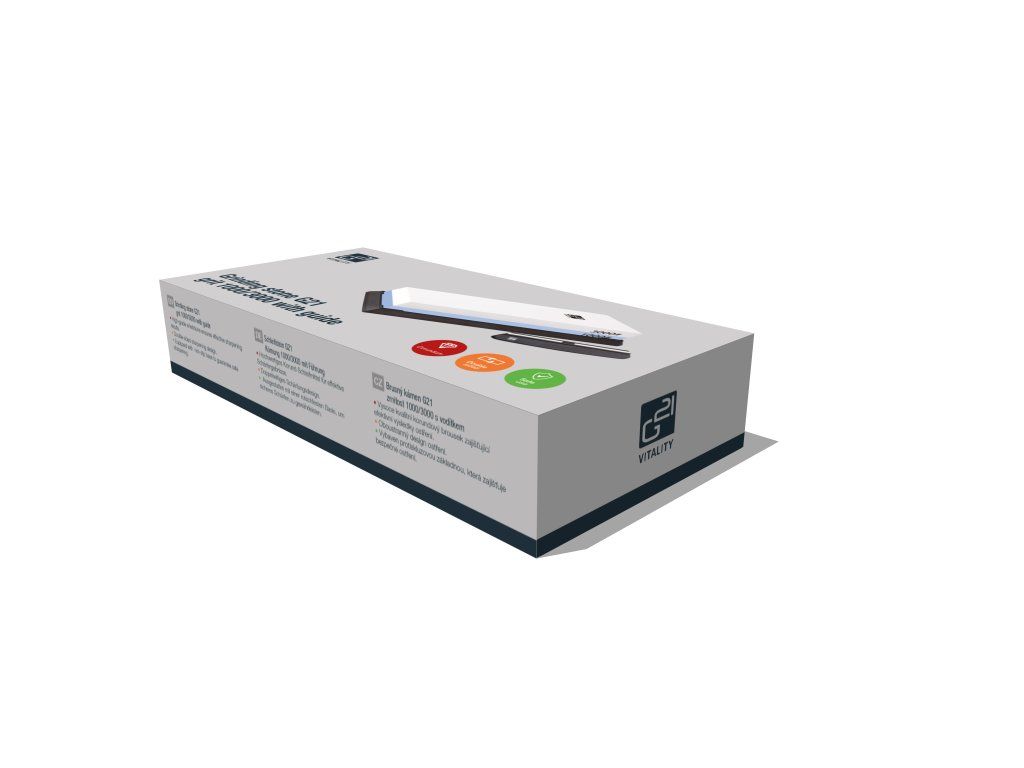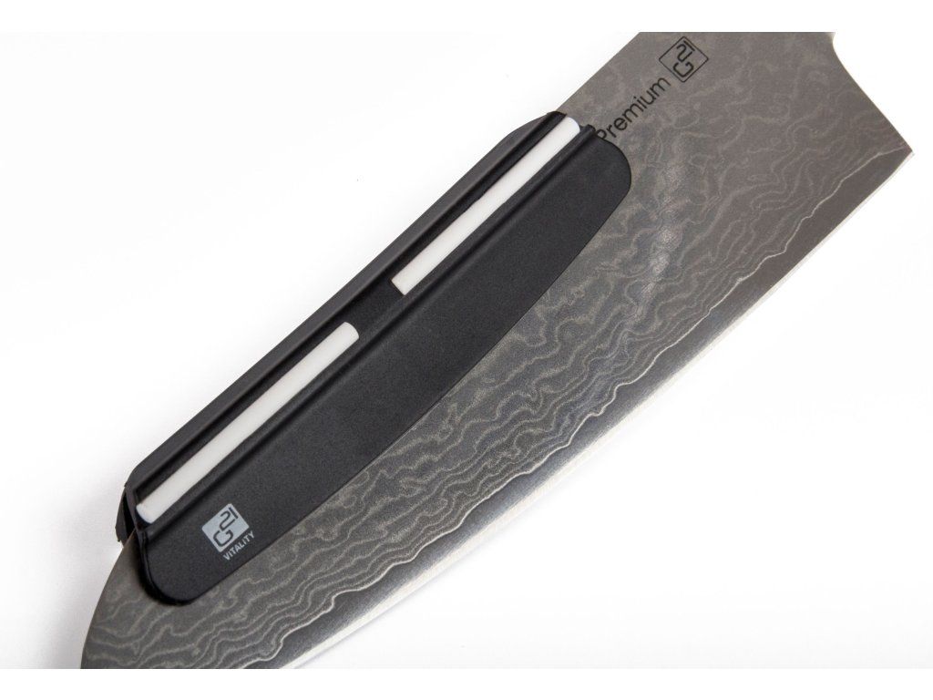 Brusný kámen z korundu je uložen v silikonovém bloku s výřezem na míru. V balení naleznete i šikovné vodítko s nastaveným úhlem broušení (15 °).