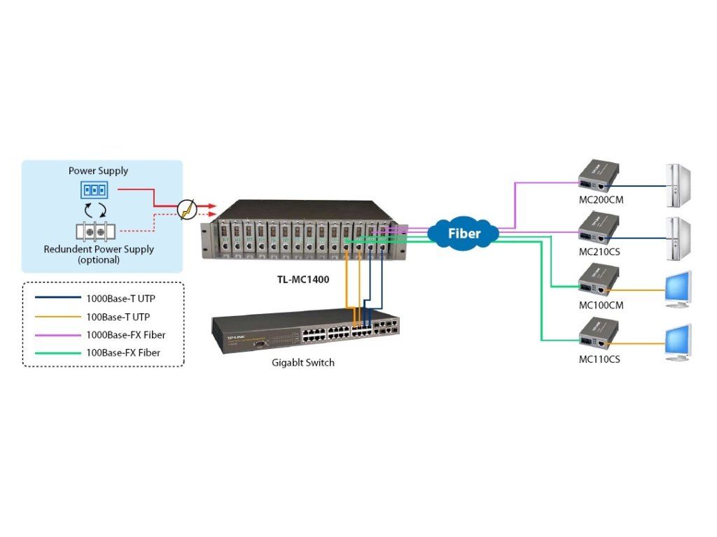 Case TP-Link TL-MC1400 14-Slotové šasi pro media Precizně vyrobený case rackového rozměru (2U) určený pro 14 media konvertorů. Case je dodáván včetně aktivního chlazení a napájení. Case má pasivní backplane a sdílí napájení pro mediakonvertory - může mít až 2 napájecí zdroje - dodávaný střídavý nebo stejnosměrný. Media konvertory se do casu montují pomocí dodávaných lyžin. Case zjednodušuje instalaci většího počtu media konvertorů v rozvaděči a je určen pouze pro mediakonvertory značky TP-LINK verze s označením "v2", které mají 9 V napájení (tyto "v2" konvertory výrobce dodává od poloviny roku 2009). Tabulka parametrů: ------------------ Napájení: 100 - 230 V, 50 až 60 Hz Provozní teplota: 0 - 40 °C Rozměry: Rack 2U, 482 x 358 x 86 mm Sloty: 14x media konvertor Hmotnost: 8 kg Výstupní napětí: 9,5 V, 9,5 A Kompatibilní media konvertory: MC100CM Fast Ethernet Media Converter (10/100M RJ45 to 100M multi-mode SC Fiber) MC110CS Fast Ethernet Media Converter (10/100M RJ45 to 100M single-mode SC Fiber) MC111CS WDM Fast Ethernet Media Converter (10/100M RJ45 to 100M single-mode SC Fiber) MC112CS WDM Fast Ethernet Media Converter (10/100M RJ45 to 100M single-mode SC Fiber) MC200CM Gigabit Ethernet Media Converter (10/100/1000M RJ45 to 1000M multi-mode SC Fiber) MC210CS Gigabit Ethernet Media Converter (10/100/1000M RJ45 to 1000M single-mode SC Fiber) MC211CS WDM Gigabit Ethernet Media Converter (10/100/1000M RJ45 to 1000M single-mode SC Fiber) MC212CS WDM Gigabit Ethernet Media Converter (10/100/1000M RJ45 to 1000M single-mode SC Fiber) MC220L Gigabit Ethernet Media Converter (10/100/1000M RJ45 to 1000M multi-mode/single-mode LC Fiber)Doplňkové parametry