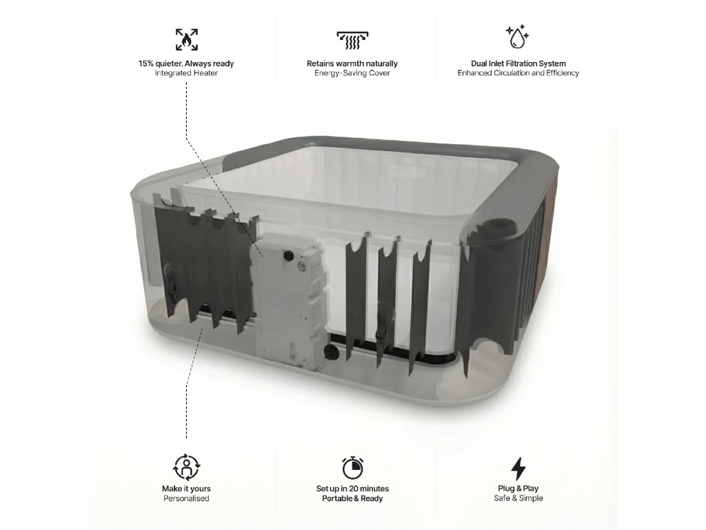 Moderní vířivý bazén CF Pacific 6 přináší maximální komfort, úsporný provoz a chytré ovládání. Díky čtvercovému tvaru perfektně využije prostor, snadno se instaluje během 20 minut a poskytne relaxaci až při 40 °C – kdykoliv se vám zachce. • Čtvercový tvar • pro 6 osob • Vestavěná filtrace • Až o 50 % nižší spotřeba energie • Ohřev vody až na 40 °C • Plug & Play – instalace cca 20 minut • WiFi ovládání přes mobil • Kryt vířivky v ceně