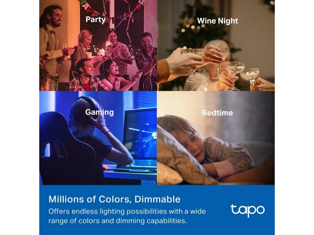 Chytrá žárovka Tapo L430C od TP-Link vás nadchne širokou škálou funkcí. Vyhrajte si s jejím nastavením a zvolte si z 16 milionů barev osvětlení. Vyberte si oblíbený odstín, který se hodí k vaší aktivitě. Ať už plánujete herní večer s přáteli, rodinné setkání, romantickou večeři se svou druhou polovičkou nebo třeba sledování filmu. Žárovka vám pomůže vytvořit dokonalou atmosféru.