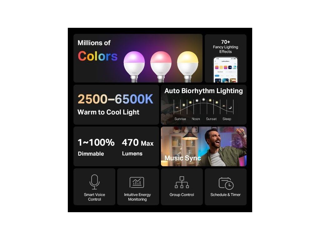 Chytrá žárovka TP-Link Tapo L430P E14 vám umožní vytvořit přesně takovou atmosféru, jakou si právě přejete – ať už barevnou, teplou, nebo studenou. S možností nastavit 16 milionů barev, stmívatelností od 1 % do 100 % a barevnou teplotou 2 500–6 500 K se žárovka přizpůsobí každé situaci – od relaxace po práci.