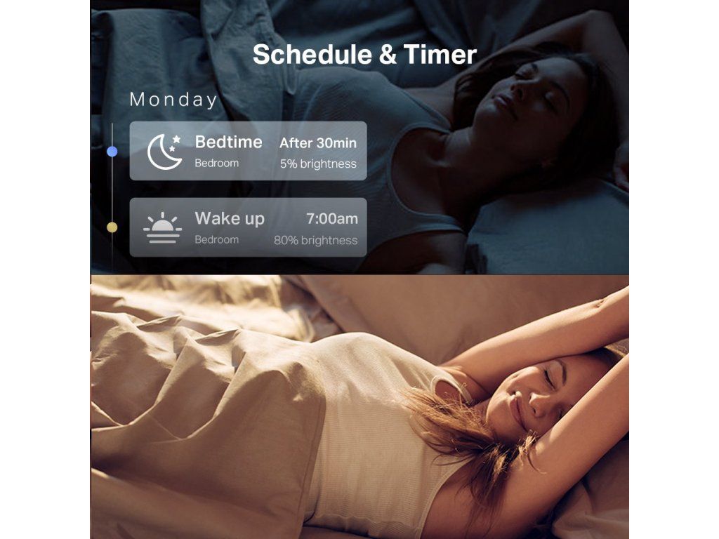 Bojíte se nezvaných hostů ve vaší domácnosti v době nepřítomnosti, např. když jste na dovolené nebo v práci, na výlětě apod.? Nastavte si automatické rozsvěcení a zhasínání podle časového rozvrhu! Stejně tak si můžete např. zpříjemnit probouzení nastavením automatického rozsvícení s nižší intenzitou světla.