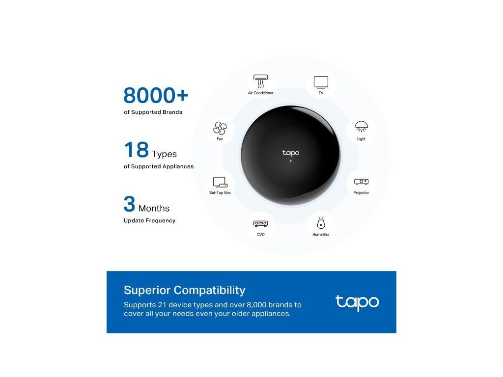 IoT hub TP-Link Tapo H110 vám zjednoduší správu vaší chytré domácnosti. Je kompatibilní s širokou škálou zařízení, které s ním propojíte. Podporuje 18 typů zařízení a více než 8 000 značek. Kromě toho dochází každé 3 měsíce k postupné aktualizaci databáze a kompatibilita hubu se tím rozšiřuje o nové modely. Spolupracuje s chytrými zařízeními Tapo (například kamery a senzory).