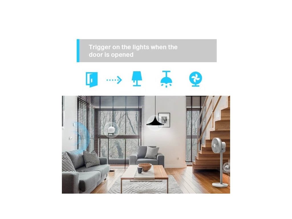 Chytrý detektor zaznamenává pohyb a zapíná připojená zařízení (chytrá světla, ventilátor, atd.), detekce až na 7 m v úhlu 120°, časový program, jednoduchá montáž, provozní teplota od 0 do 40 °C, baterie CR2450.