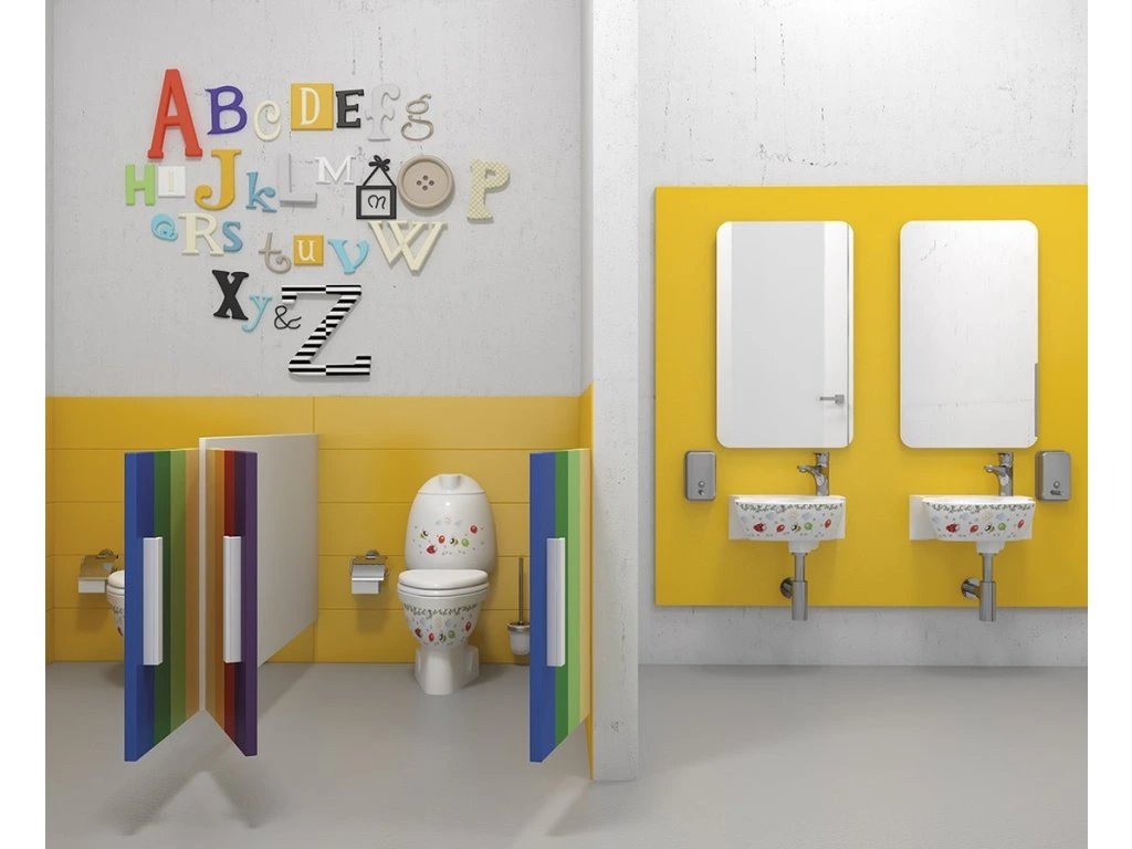 Série dětské keramiky KID je vhodná nejen pro jesle či mateřské školky, ale nalezne své místo i ve standardní koupelně a všude tam, kde je běžná keramika pro děti příliš velká. Lze volit bílou keramiku nebo veselý barevný potisk, který jistě vykouzlí úsměv na tvářích všech malých uživatelů.