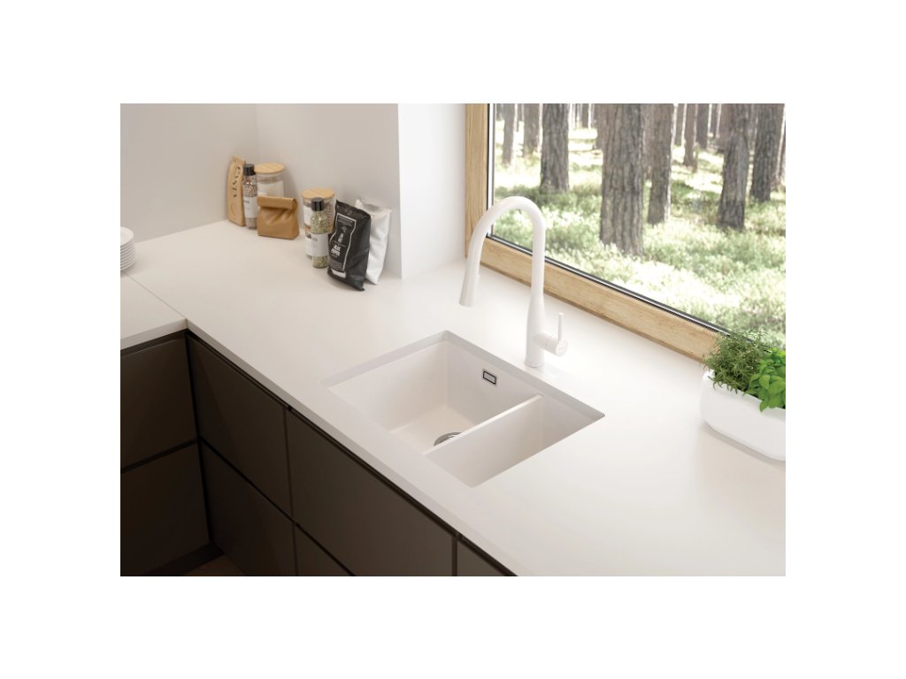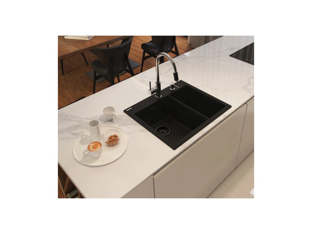 - Granitový dřez určený k instalaci na desku nebo pod desku