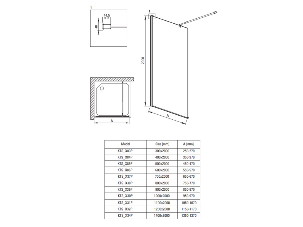 Tabulka rozměrů Walk-In sprchového koutu Kerria Plus