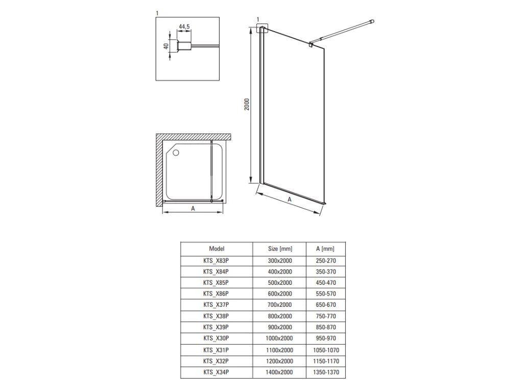 Tabulka rozměrů Walk-In sprchového koutu Kerria Plus