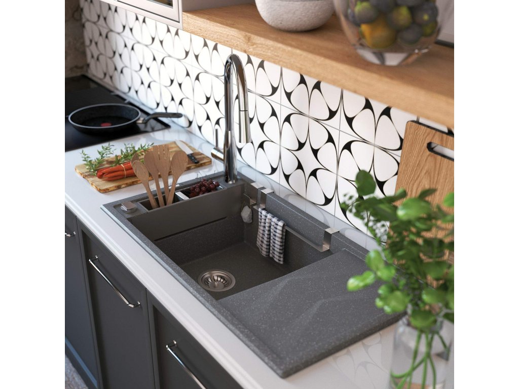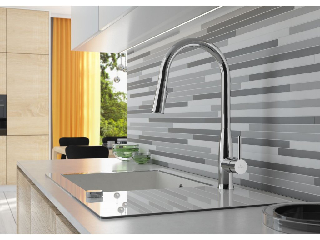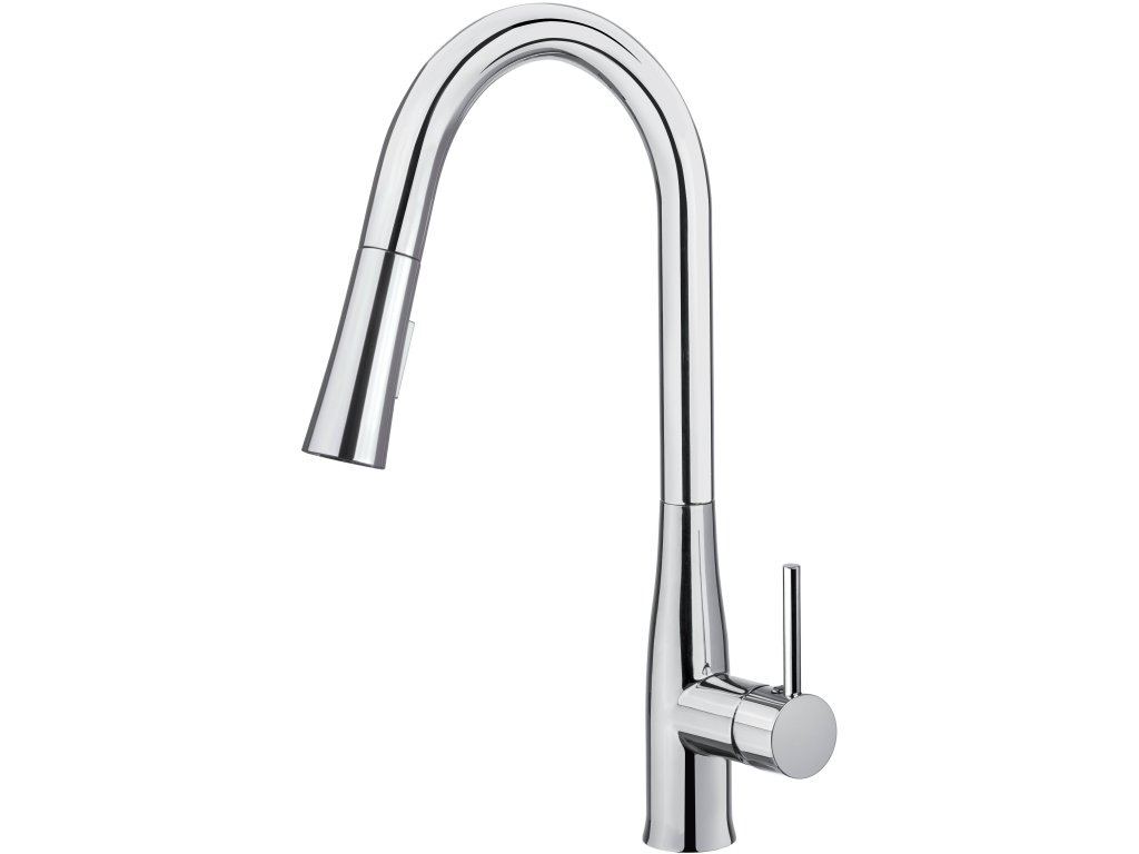Dřezová baterie s výtokovou trubicí ve tvaru U a vytahovacím ramínkem v klasickém provedení z lesklé chromované oceli představuje dokonalý způsob, jak zařídit kuchyň v moderním a elegantním stylu. Představená dřezová baterie s vysokým zaobleným tělem a vytahovací dvoufunkční výtokovou trubicí (která uživateli nabízí provzdušňovaný a dešťový proud) je velmi praktická a pohodlná na používání. Tato baterie vám usnadní udržování čistoty v okolí dřezu a také usnadní plnění vysokého nádobí vodou, mytí zeleniny a mytí rukou. Zajímavý design s jemně se rozšiřující základnou a výlevkou přitahuje pozornost svým neodolatelným půvabem a díky němu dřezová baterie dodá interiéru kuchyně originální nádech.