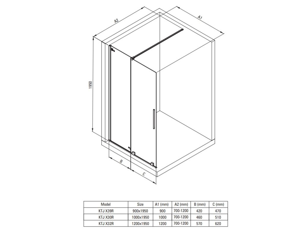Tabulka rozměrů sprchového koutu Walk-In Prizma