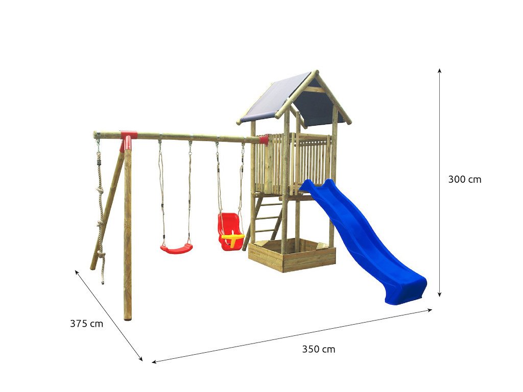 Popis produktu Dětské hřiště MARIMEX PLAY Basic 005 má ve výbavě skluzavku, šplhací lano, houpací sedátko a houpačku i pískoviště se sedátky. Dětské hřiště Basic 005 splňuje normy EN 71 Bezpečnosti hraček. Dřevěný materiál použitý na dětském hřišti je opracován tak, aby snižoval riziko zranění dětí. Zároveň je impregnován pro dlouhou životnost a vysokou odolnost celého hřiště. Sestava je dodávaná bez kotvení k zemi. Kotvy je možné dokoupit samostatně. Zakoupit je můžete ZDE. Dětská hřiště Marimex Play Basic jsou oproti klasickým Marimex Play rozměrově menší. Disponují impregnací KDI, neboli tzv. "zelenou impregnací". Certifikát FSC® Produkt disponuje certifikátem FSC®, který zaručuje, že při výrobě bylo šetrně zacházeno s přírodními zdroji. Organizace Forest Stewardship Council obecně podporuje ekologické, sociálně prospěšné a ekonomicky životaschopné obhospodařování lesů. Výbava: skluzavka 2,50 m s integrovanou přípojkou na vodu, barva dle skladové dostupnosti houpací sedátko závěsná houpací sedačka šplhací lano pískoviště se 2 sedátky Parametry: maximální zátěž: 70 kg určeno pro max. 2 děti dřevěný materiál: borovice impregnace: KDI Výhody dětských hřišť Kvalitní materiály Veškeré komponenty jsou vyrobeny z robustního plastu, odolného kovu a borovicového dřeva, které je povrchově ošetřeno proti nepříznivým vlivům počasí. Zábava pro všechny Hřiště se skládají z rozličných prvků v podobě domečků, věží, skluzavek, houpaček, žebříků, lezeckých stěn, šplhacích lan a tyčí. Stačí si vybrat vhodnou sestavu podle věku dítěte. Bezpečnost Bezstarostné užívání je pro nás prioritou, proto všechna dětská hřiště prošla náročnými testy jakosti i bezpečnosti a splňují normy EN 71 Bezpečnosti hraček. Rozměry: rozměry celé sestavy: 375 x 300 x 350 cm výška podesty - 120 cm rozměry pískoviště: 100 x 100 cm rozměr hlavní stojny domečku: 8 x 8 x 250 cm rozměr břevna houpačky: 10 x 10 x 250 cm rozměr stojen u houpačky: 8 x 8 x 218 cm POZOR:barva skluzavky je dodávaná dle skladové zásoby - nelze požadovat zaslání konkrétní barvy. Impregnace dřeva a ochranný nátěr Dřevo našich výrobků je ošetřeno tlakovou hloubkovou impregnací. Tato impregnace se někdy může na povrchu dřeva projevit zelenými či bílými skvrnami, které po určitém čase v důsledku klimatických podmínek zmizí a vzhled dřeva se sjednotí. Stejně tak se může v?balení objevit kondenzovaná vlhkost. V?obou případech se nejedná o výrobní vady, ale o normální technologický postup. Před sestavením produktu doporučujeme dřevo očistit jemným smirkovým papírem nebo suchým hadrem a natřít lazurou nebo barvou na dřevo. Vhodný přípravek vám doporučí v?každém hobbymarketu. Hřiště jsou určena pouze pro soukromé účely. Nesmí být využíváno pro komerční využití. Je určeno pro venkovní použití. Varování: Pouze pro domácí použití. Z bezpečnostních důvodů je potřeba sestavu řádně připevnit k zemi, a to např. kotvou, nebo betonáží.
