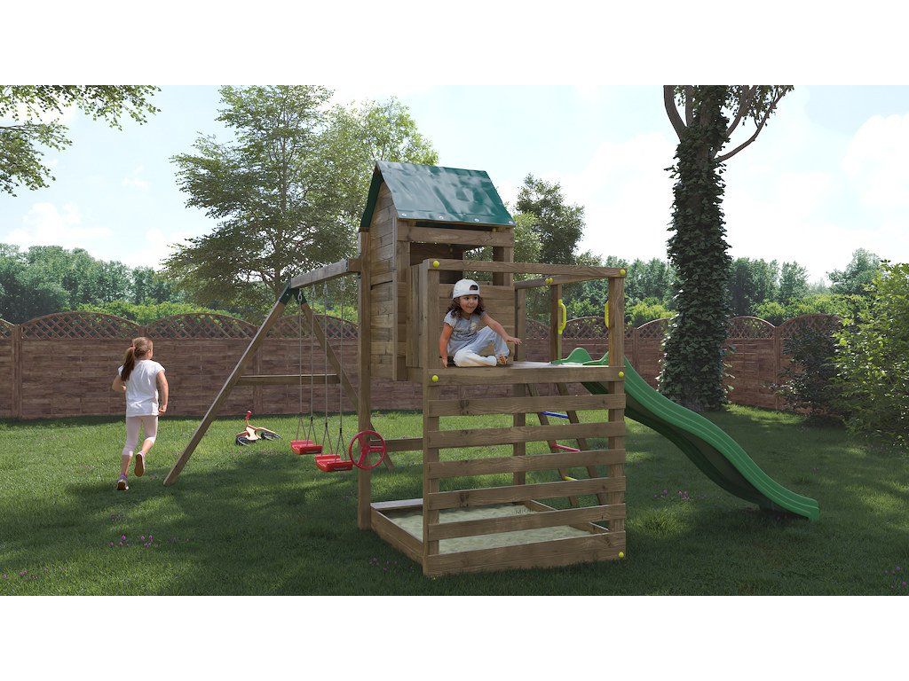 Dětské hřiště MARIMEX PLAY Basic 007 má ve výbavě domeček se stříškou, skluzavku, dvě houpačky i pískoviště se sedátky. Dětské hřiště Basic 007 splňuje normy EN 71 Bezpečnosti hraček. Dřevěný materiál použitý na dětském hřišti je opracován tak, aby snižoval riziko zranění dětí. Zároveň je impregnován pro dlouhou životnost a vysokou odolnost celého hřiště. Dětská hřiště Marimex Play Basic jsou oproti klasickým Marimex Play rozměrově menší. Disponují impregnací KDI, neboli tzv. "zelenou impregnací". Certifikát FSC® Produkt disponuje certifikátem FSC®, který zaručuje, že při výrobě bylo šetrně zacházeno s přírodními zdroji. Organizace Forest Stewardship Council obecně podporuje ekologické, sociálně prospěšné a ekonomicky životaschopné obhospodařování lesů. Výbava: skluzavku 2,2 m s integrovanou přípojkou na vodu, barva dle skladové dostupnosti domeček se stříškou 80 x 80 x 135 cm dvě houpačky pískoviště se sedátky žebřík s kovovými stupni dřevěný žebřík volant ve výbavě 6 ks kotev upevňujících sestavu k zemi madla a zábradlí plastové kryty šroubů sada nářadí na sestavení Parametry: určeno pro max. 10 dětí dřevěný materiál: borovice impregnace: KDI Výhody dětských hřišť Kvalitní materiály Veškeré komponenty jsou vyrobeny z robustního plastu, odolného kovu a borovicového dřeva, které je povrchově ošetřeno proti nepříznivým vlivům počasí. Zábava pro všechny Hřiště se skládají z rozličných prvků v podobě domečků, věží, skluzavek, houpaček, žebříků, lezeckých stěn, šplhacích lan a tyčí. Stačí si vybrat vhodnou sestavu podle věku dítěte. Bezpečnost Bezstarostné užívání je pro nás prioritou, proto všechna dětská hřiště prošla náročnými testy jakosti i bezpečnosti a splňují normy EN 71 Bezpečnosti hraček. Rozměry: rozměry celé sestavy: 430,1 x 252,5 x 362,6 cm rozměr podesty - 130 x 130 cm POZOR: barva skluzavky je dodávaná dle skladové zásoby - nelze požadovat zaslání konkrétní barvy. Impregnace dřeva a ochranný nátěr Dřevo našich výrobků je ošetřeno tlakovou hloubkovou impregnací. Tato impregnace se někdy může na povrchu dřeva projevit zelenými či bílými skvrnami, které po určitém čase v důsledku klimatických podmínek zmizí a vzhled dřeva se sjednotí. Stejně tak se může v?balení objevit kondenzovaná vlhkost. V?obou případech se nejedná o výrobní vady, ale o normální technologický postup. Před sestavením produktu doporučujeme dřevo očistit jemným smirkovým papírem nebo suchým hadrem a natřít lazurou nebo barvou na dřevo. Vhodný přípravek vám doporučí v?každém hobbymarketu. Hřiště jsou určena pouze pro soukromé účely. Nesmí být využíváno pro komerční využití. Je určeno pro venkovní použití. Varování: Pouze pro domácí použití. Z bezpečnostních důvodů je potřeba sestavu řádně připevnit k zemi, a to např. kotvou, nebo betonáží.