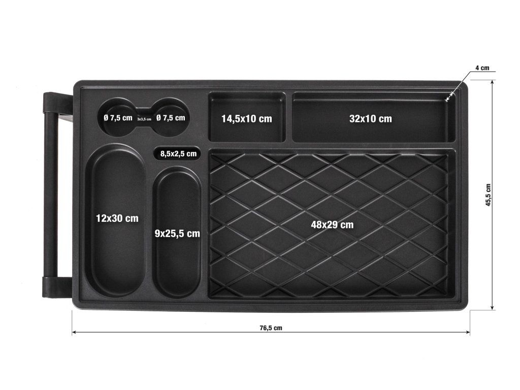 Díky promyšlenému řešení horní strany můžete mít na pracovní desce odložené věci, aniž by spadly při pohybu vozíku. V pracovní desce jsou zapuštěné přihrádky, ve kterých můžete mít uloženy nejčastěji používané nářadí, šrouby a díly, které potřebujete mít stále při ruce a podobně.