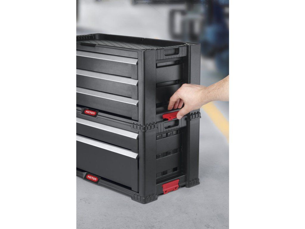 Úložný box na nářadí obsahuje jednu hlubokou zásuvku s odnímatelnými přihrádkami, do které můžete uložit velké a těžké nástroje. Další 4 zásuvky slouží pro uložení drobnějších nástrojů a příslušenství. Jedna ze čtyř menších zásuvek je vybavena 16 vyjímatelnými organizéry na drobné příslušenství, jako jsou hřebíky, šroubky, hmoždinky a jiné drobnosti. Organizéry umožňují snadné roztřídění příslušenství podle druhů a velikostí. Všechny dělící příčky v zásuvkách lze snadno vyjmout a vytvořit tak volný prostor pro větší nástroje. Každý samotný blok se zásuvkami lze zajistit proti otevření vestavěným posuvným zámkem. Nechybí ani očko pro zajištění visacím zámkem.