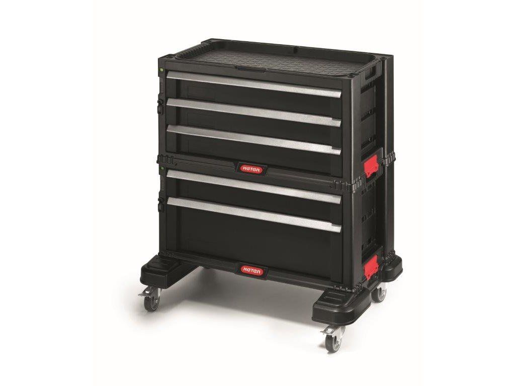 Dílenský vozík Keter s 5 zásuvkami nabízí úložný prostor pro velké množství nářadí, jako jsou šroubováky, kleště, vrtačky nebo aku nářadí a další nástroje a příslušenství. Je vyrobený z pevného a odolného plastu.