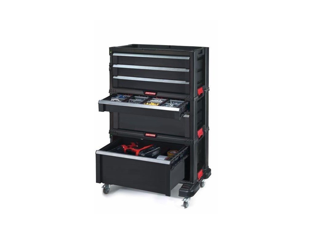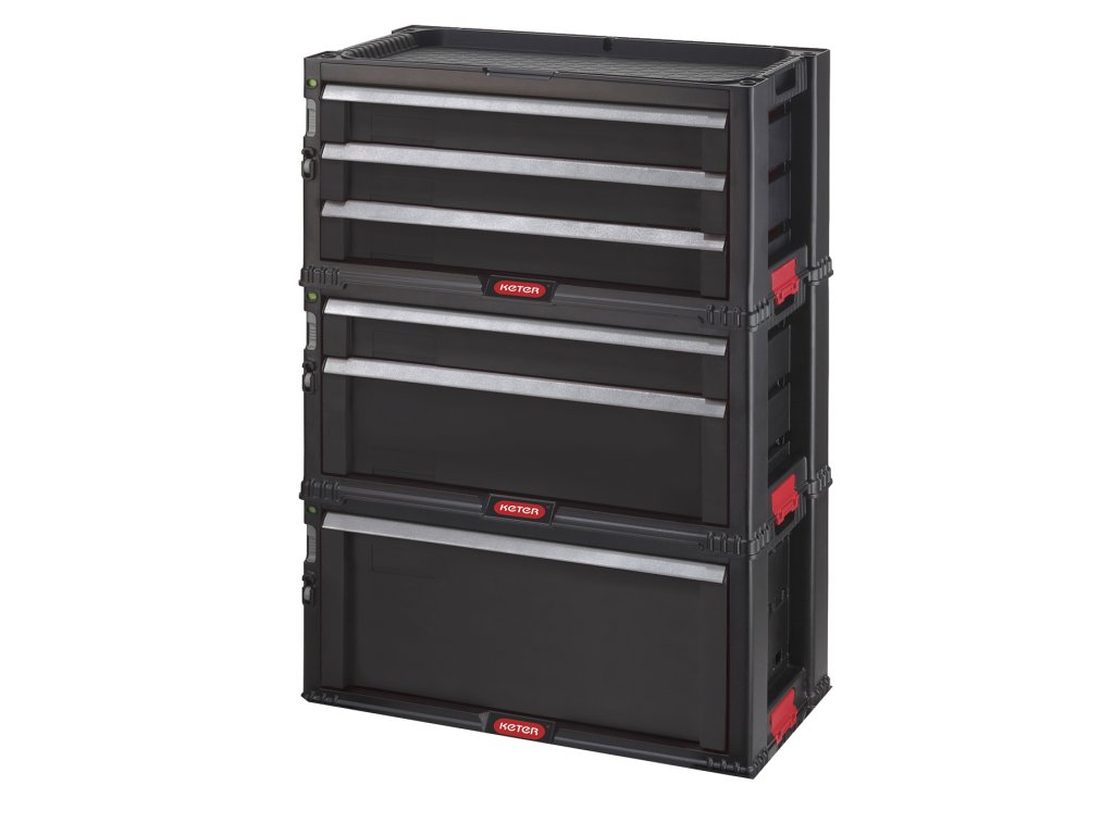 Úložný box na nářadí obsahuje dvě hluboké zásuvky s odnímatelnými přihrádkami, do kterých můžete uložit velké a těžké nástroje. Další 4 zásuvky slouží pro uložení drobnějších nástrojů a příslušenství. Jedna ze čtyř menších zásuvek je vybavena 16 vyjímatelnými organizéry na drobné příslušenství, jako jsou hřebíky, šroubky, hmoždinky a jiné drobnosti. Organizéry umožňují snadné roztřídění příslušenství podle druhů a velikostí. Všechny dělící příčky v zásuvkách lze snadno vyjmout a vytvořit tak volný prostor pro větší nástroje. Každý samotný blok se zásuvkami lze zajistit proti otevření vestavěným posuvným zámkem. Nechybí ani očko pro zajištění visacím zámkem.
