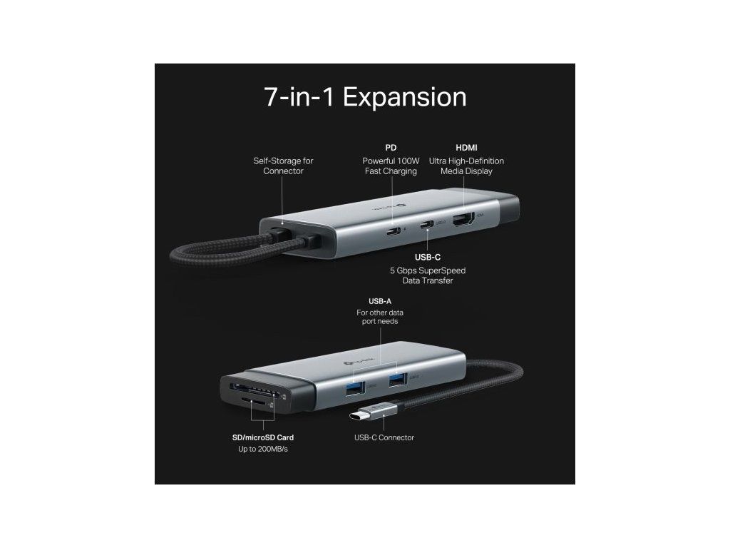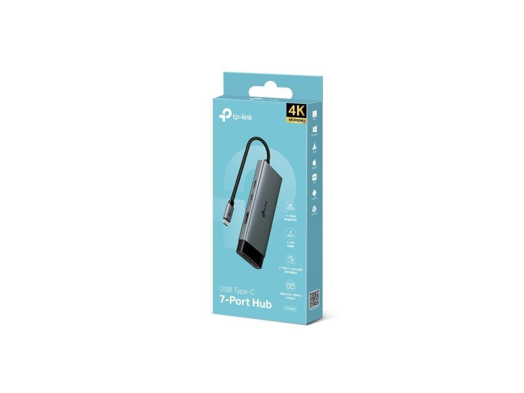 Rozšiřte možnosti svého zařízení s dokovací stanicí TP-Link UH7020C. Na jednom kompaktním zařízení se nachází celkem 7 portů. Najdete na něm port HDMI s podporou rozlišení 4K při 60 Hz, slot na SD/microSD kartu, podporu 100W napájení a superrychlé USB porty (až 5 Gb/s). Díky snadné Plug & Play instalaci je stanice ideální pro každodenní práci i zábavu.