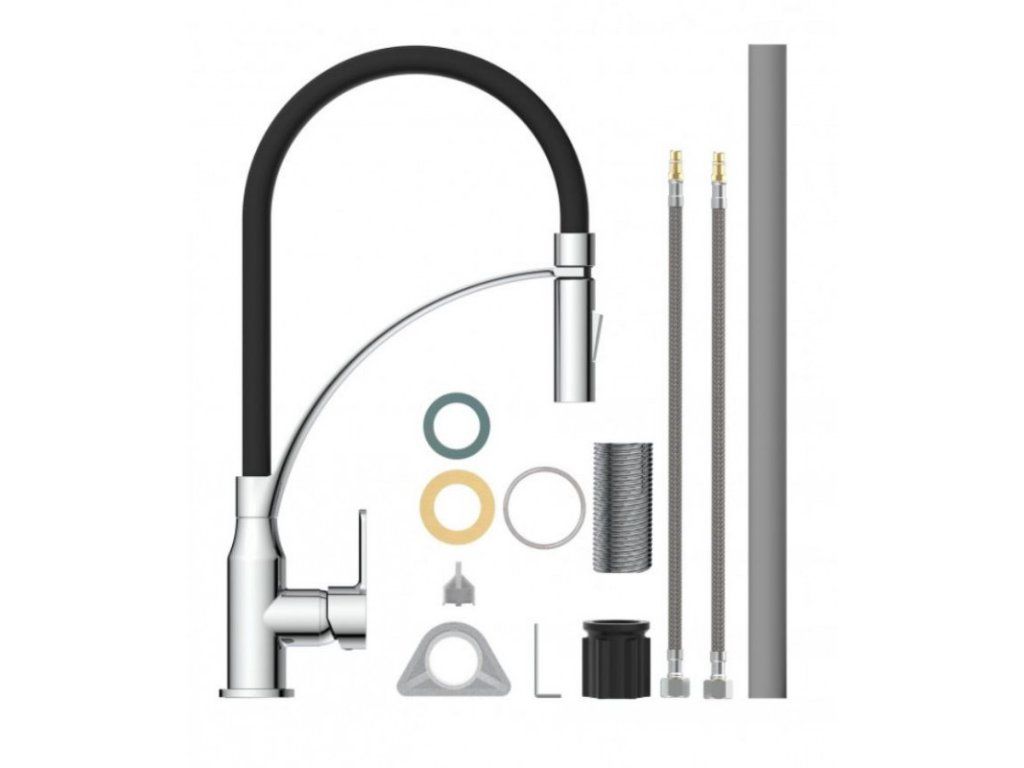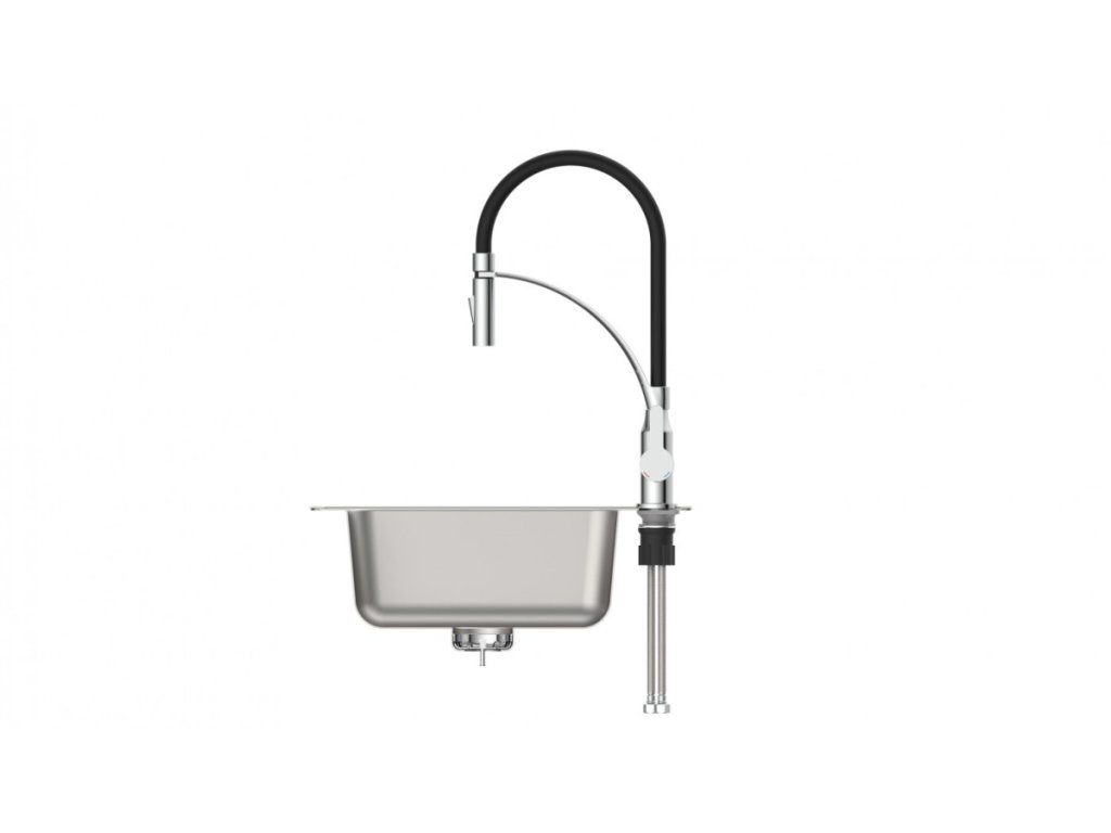 Díky kombinaci otočného výtoku a ohebné hlavici je baterie ideální volbou pro dvojité dřezy. Kuchyňská baterie disponuje funkcí studeného startu tj. ve středové poloze páky teče pouze studená voda.