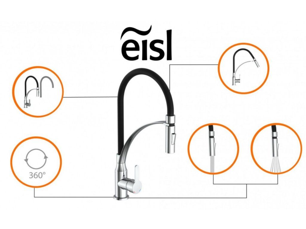 Vysoká dřezová baterie Eisl Carneo se bude skvěle vyjímat také jako ostrůvková baterie. Baterie disponuje pružnou hlavicí pro jednoduší manipulaci v kuchyni. Zároveň na konci hlavice najdete přepínač trysky nebo sprchy.