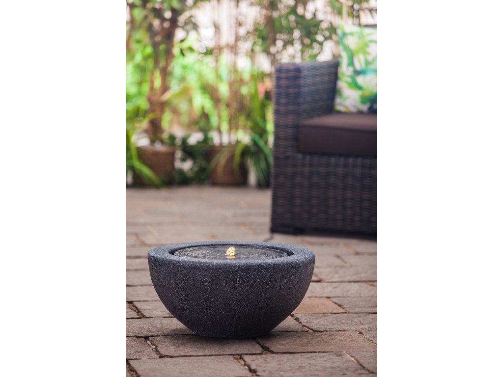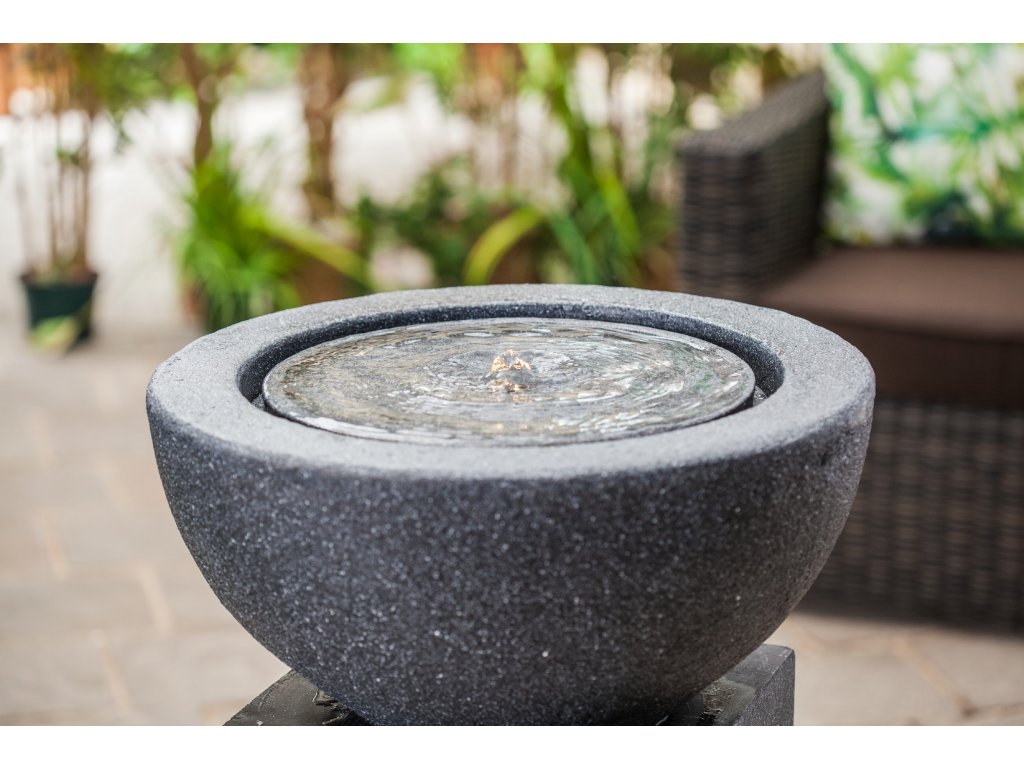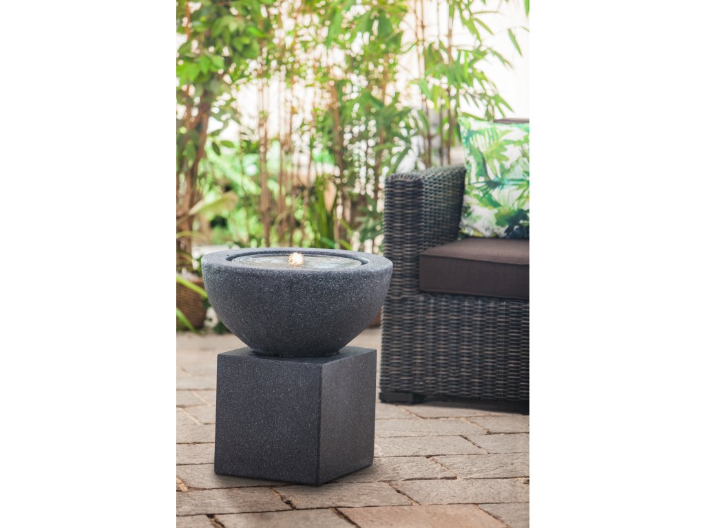 Fontána Heissner Half BALL LED, antrazit Designová zahradní fontána Heissner je vkusným doplňkem na každou terasu, zahradu, do haly, či kamkoliv do interiéru. Uklidňující zvuk vody a nasvícení vody pomocí LED osvětlení vytvoří vždy příjemnou relaxační atmosféru. Fontána je vyrobena zmateriálu Polystone, který se často označuje jako umělý kámen. Na první pohled je od kamene neroznatelný, vyniká vdlouhé životnosti, ale je lehčí než přírodní kámen. Fontána je dodávána jako kompletní set. Kromě těla fontány se sběrnounádržkou na vodu je součástí balení čerpadlo s5 m dlouhým kabelem a LED osvětlení. Fontána funguje jako uzavřený okruh, kdy se do sběrné nádržky naleje voda, která pomocí čerpadla vyvěrá z fontány a poté přes fontánu stéká zpět do sběrné nádržky. Zapojení i zprovoznění fontány je velmi jednoduché a zabere pár minut. Kfontáně je možné dokoupit podstavec (podstavec na fotkách není součástí balení). Parametry:Materiál PolystoneBarva antracitLED osvětlení anoRozměr v cm (DxŠxV) 50 x 50 x 25Výkon čerpadla 250 l/hPříkon čerpadla 2,2 WDélka kabelu 5 mDoplňkové parametry
