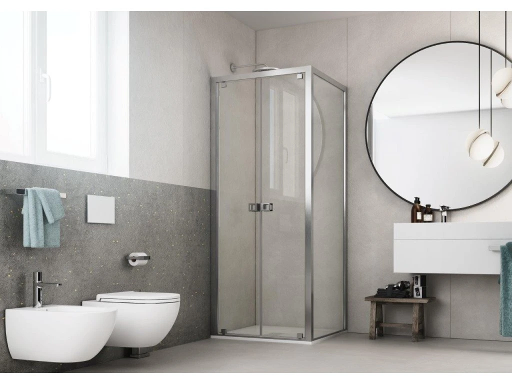 2-křídlé "lítací" skleněné dveře ESSENCE N2B nabízí jednoduché a přitom praktické řešení bez použití pohyblivých - posuvných dveří, ale s maximálním vstupem. Vytváří velmi luxusní dojem, který je podpořen výrazným madlem. Dveře se dodávají universálním levém / pravém provedení. Bezpečnostní sklo lze opatřit za příplatek povrchovou úpravou AQUA CLEAN pro jednodušší údržbu. Dá se osadit jak na sprchové vaničky, tak i přímo na podlahu. Zástěny jsou vyrobeny z 6 mm bezpečnostního skla.