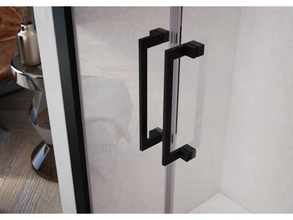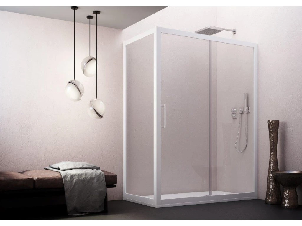 Posuvné skleněné stěny řeší atypické vstupy v prostorných koupelnách. Vytváří velmi luxusní dojem, který je podpořen výrazným chromovým madlem. Dodává se v univerzálním provedení.