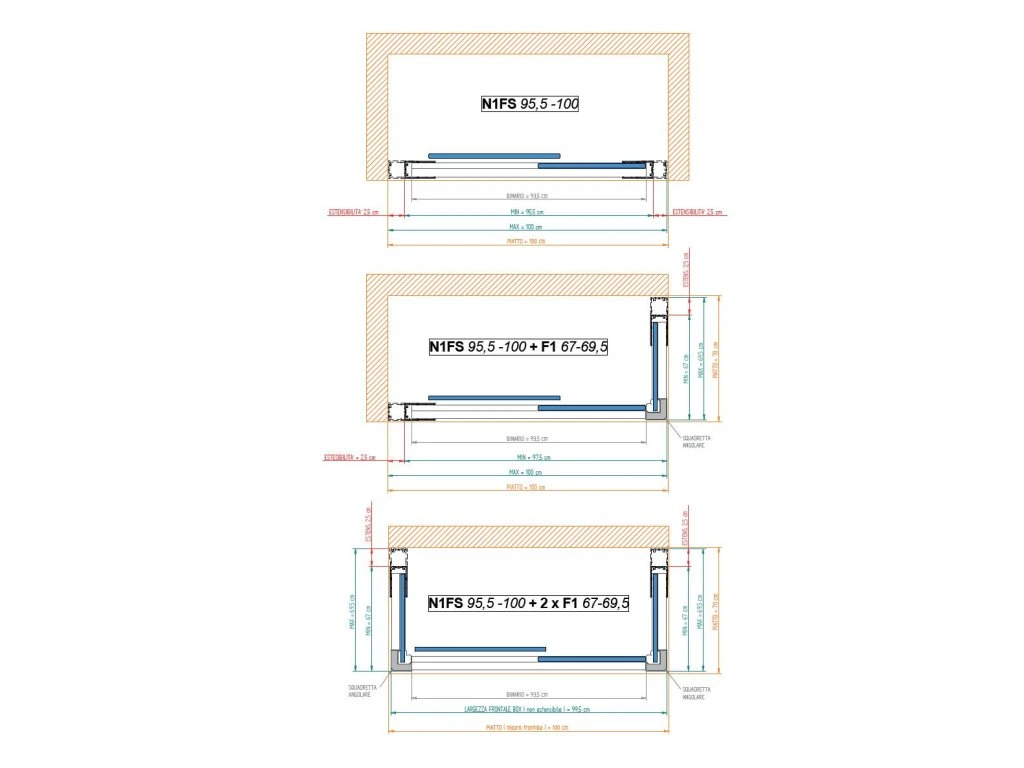 Posuvné bezbariérové skleněné stěny řeší atypické vstupy v prostorných koupelnách. Vytváří velmi luxusní dojem, který je podpořen výrazným chromovým madlem. Dodává se buď v levém SX nebo pravém DX provedení. Lze dokoupit jednu nebo dvě boční pevné stěny Essence F1, pomocí kterých poskládáte praktický sprchový kout. Pevná stěna je dodávána v univerzálním levém / pravém provedení.