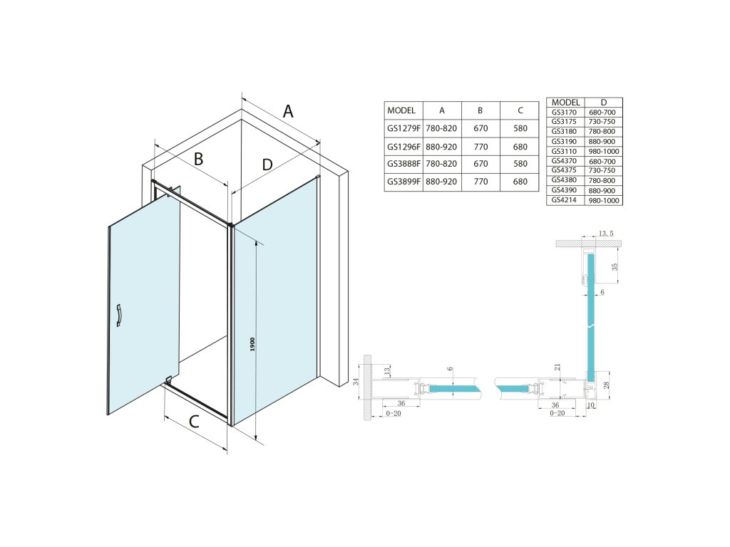• Kombinací boční stěny a dveří získáte obdélníkovou/čtvercovou zástěnu - na výběr dveře posuvné a pivotové