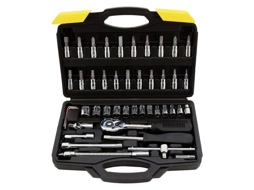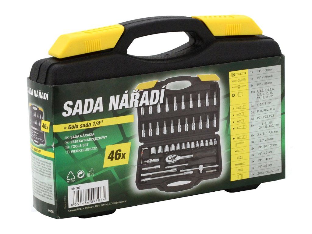 Gola sada Compass 1/4" z CrV oceli je nezbytným vybavením každého řemeslníka i domácího kutila.Ráčna je osazena 45 zubým mechanismem. Součástí sady je celá řada bitů, adaptérů a nástavců 1/4", které jsou přehledně uspořádané v malém přenosném kufříku o rozměrech 24 x 16,5 x 5,5 cm. Tak můžete sadu snadno přenášet tam, kde je zrovna potřeba i ji pohodlně skladovat v regálu.
