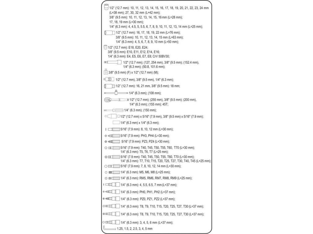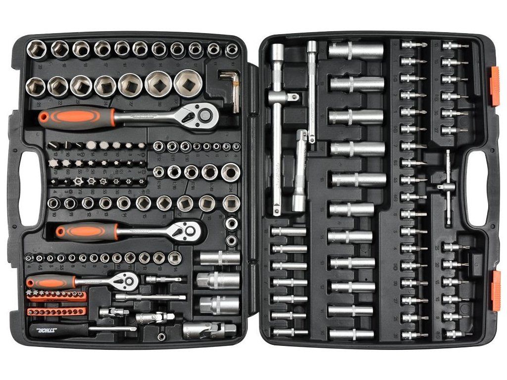 Sada Gola renomované značky Sthor obsahuje 173 kusů nářadí. V praktickém kufříku z odolného plastu tak najdete nejen ráčny ve třech velikostech, ale i nástrčné klíče. V setu mají své místo hlavice o průměru 1/2, 3/8 a 1/4 " a bity různých tvarů a velikostí (včetně šroubováku).Všechny kovové díly této sady jsou vyrobeny z vysoce kvalitní nástrojové oceli. Ráčny mají ergonomické rukojeti s protiskluzovým povrchem pro snazší manipulaci. Kufřík vám skvěle poslouží v profesionální dílně, ale i v soukromé garáži.