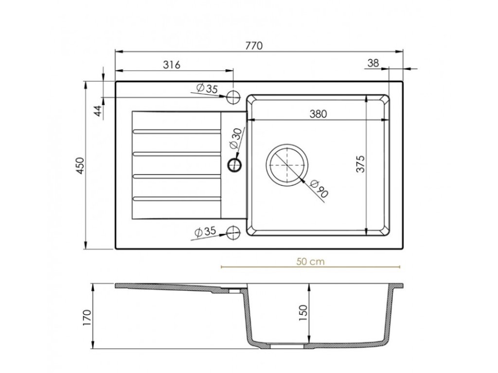 Dřez Arcos 770.0 je ideální volbou pro milovníky vaření. Kuchyňský dřez s dlouhým odkapávačem vám poskytne ještě větší pohodlí a rozšíří pracovní plochu. Odkapávač je účelně tvarovaný s drážkami, které usnadňují odtok vody. Rovněž poslouží i pro osušení nádobí.
