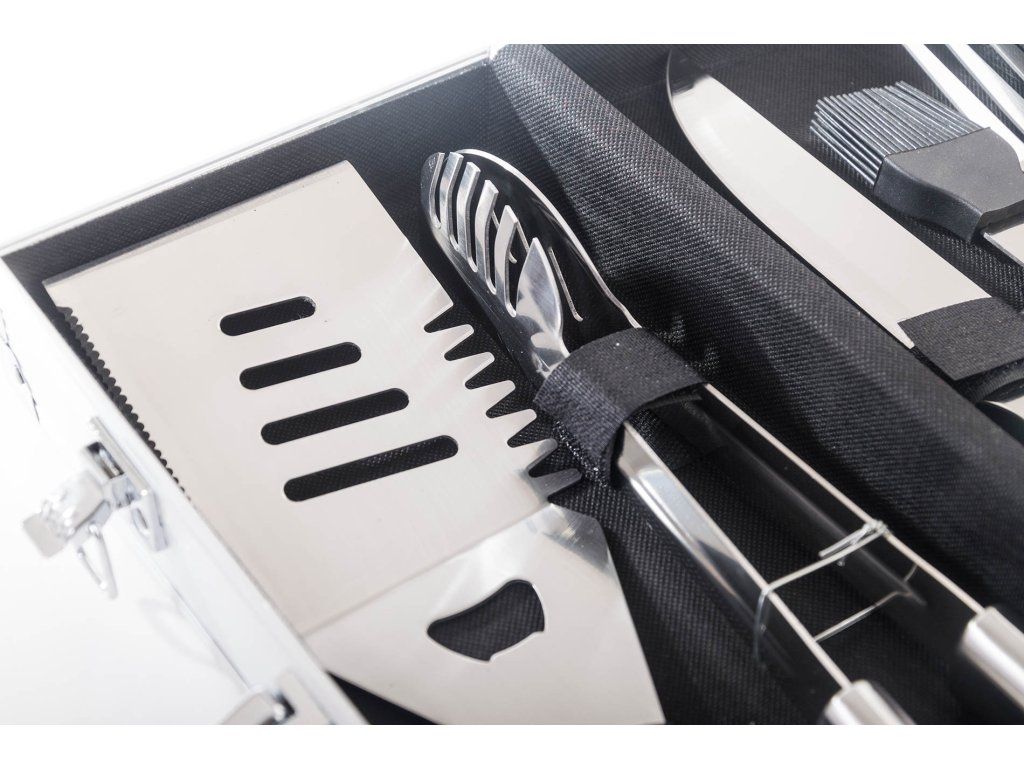 Grilovací nářadí G21 je nepostradatelnou výbavou každého zahradního šéfkuchaře. K pohodovému létu s rodinou a přáteli neodmyslitelně patří slunce, voda, osvěžující drinky a vůně grilovaných delikates, které se linou vaší zahradou. Pro pravou radost z grilování je nářadí na gril G21 jasnou volbou číslo jedna.Sada obsahuje kompletní nástroje pro grilování bez potíží. Součástí sady je obracečka, vidlička, kleště, prodloužený grilovací nůž a štětec na potírání. Délka nářadí 40 cm zajišťuje, že na vás při grilování nebudou šlehat plameny ani prskat olej z masa. Pro snadné přenášení a skladování je nářadí uloženo do praktického hliníkového kufru.