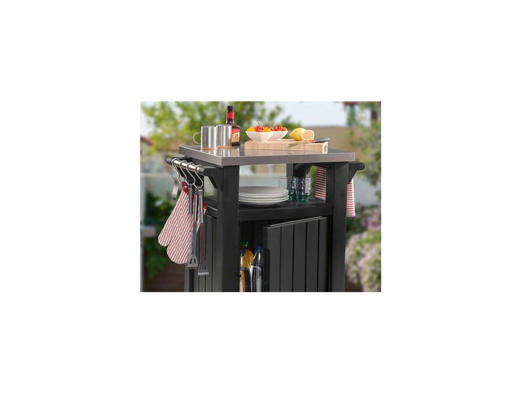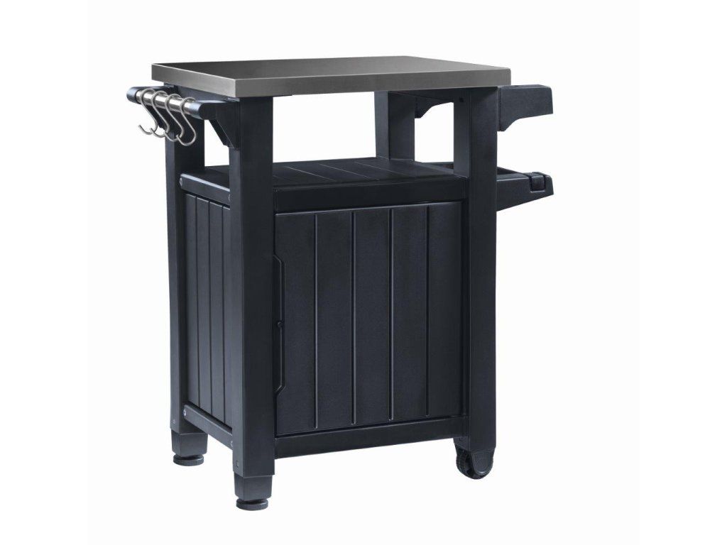 Grafitový grilovací stolek Unity značky Keter má kapacitu 105 litrů. Nerezová pracovní deska, praktická rukojeť s háčky na pověšení utěrek a kolečka pro přemisťování stolku dohromady vytvářejí dokonalé prostředí pro venkovní grilování.