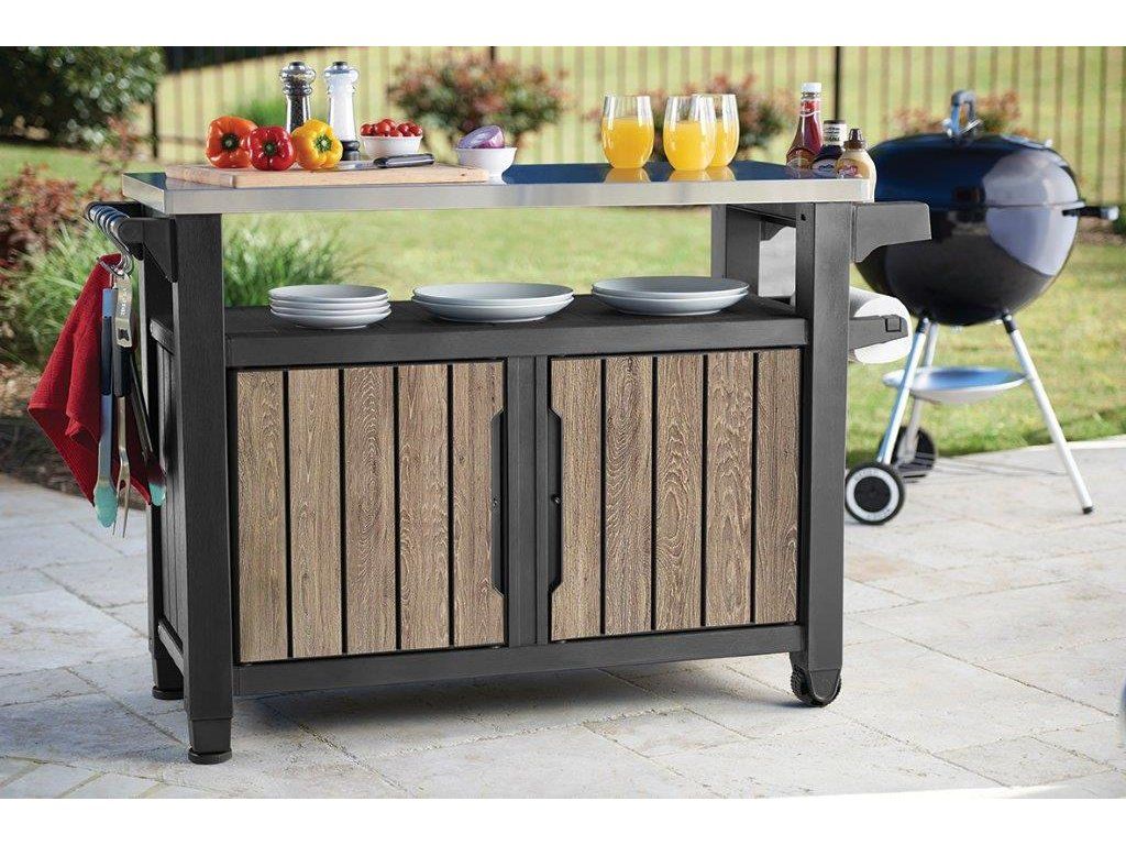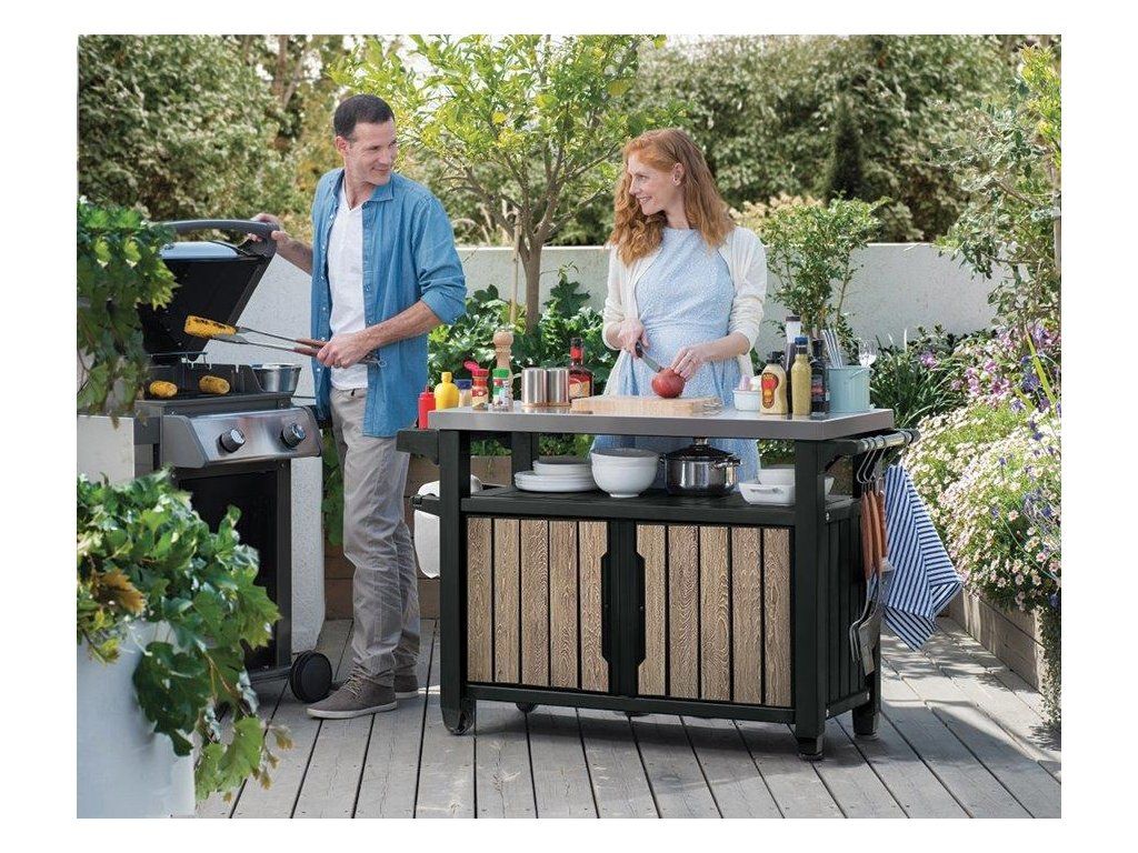 Grilovací stolek Unity XL značky Keter má kapacitu 207 litrů. Nerezová pracovní deska, praktická rukojeť s háčky na pověšení utěrek a kolečka pro přemisťování stolku dohromady vytvářejí dokonalé prostředí pro venkovní grilování. Tento multifunkční grilovací stůl si prostě zamilujete. Slouží totiž jako úložný prostor a zároveň jako odolná kuchyňská deska. Můžete tak i venku servírovat a připravovat perfektní pokrmy.